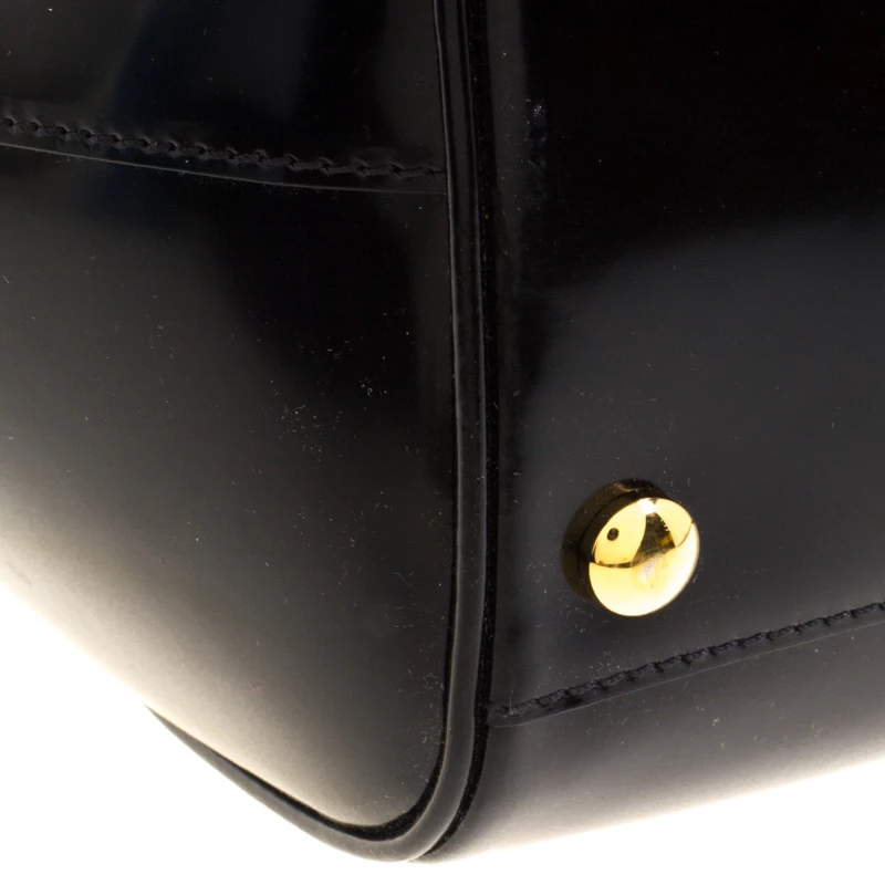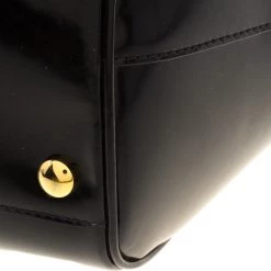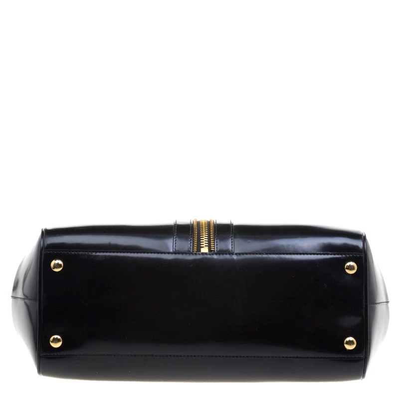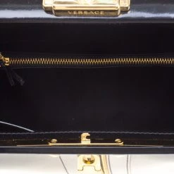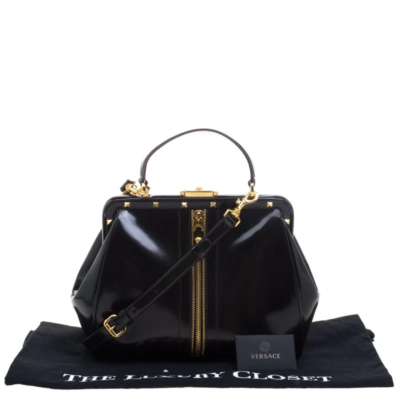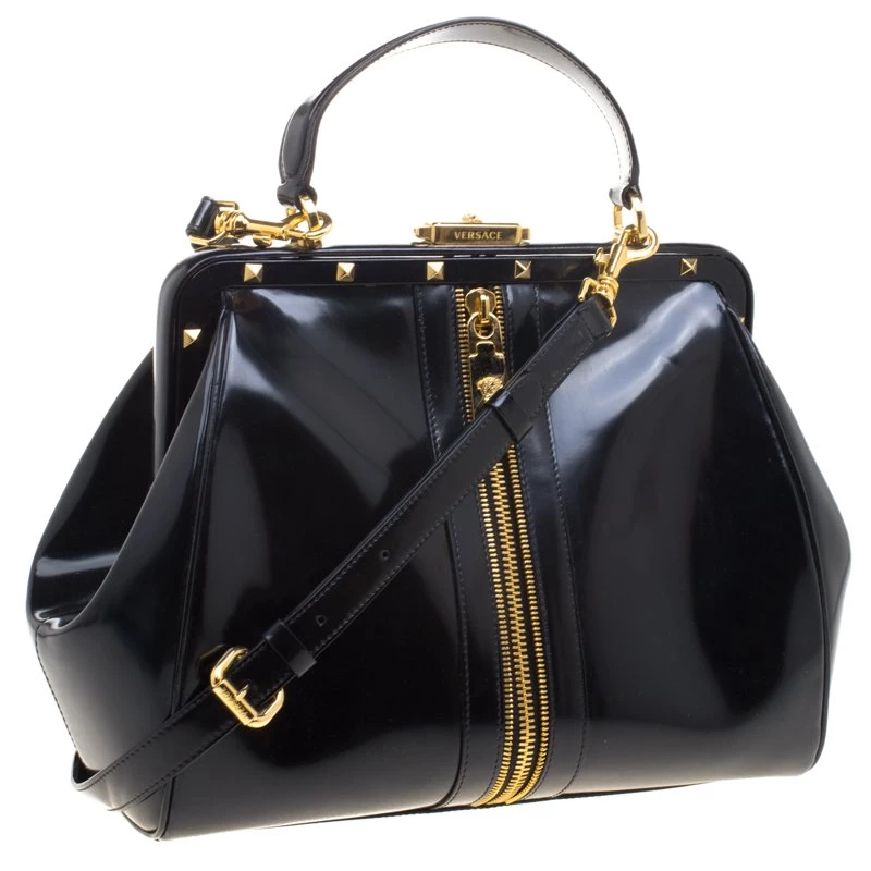 Quench your desire for the perfect satchel with this fabulous Versace piece. This black bag is ingeniously crafted from patent leather and features a top handle and a removable shoulder strap. The interiors are satin lined and the bag is complete with a front zip detail and gold-tone hardware. Spacious enough for all your essentials, this satchel will surely be an amazing addition to your bag collection.