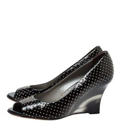 These unique and stunning pumps from the house of Versace will be a valuable addition to your shoe closet. Meticulously crafted in Italy, they are made from glossy black patent leather and adorned with studs all over. They feature a peep-toe design and an 8 cm wedge heel with gold-tone detailing.