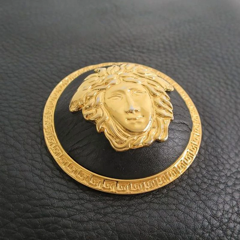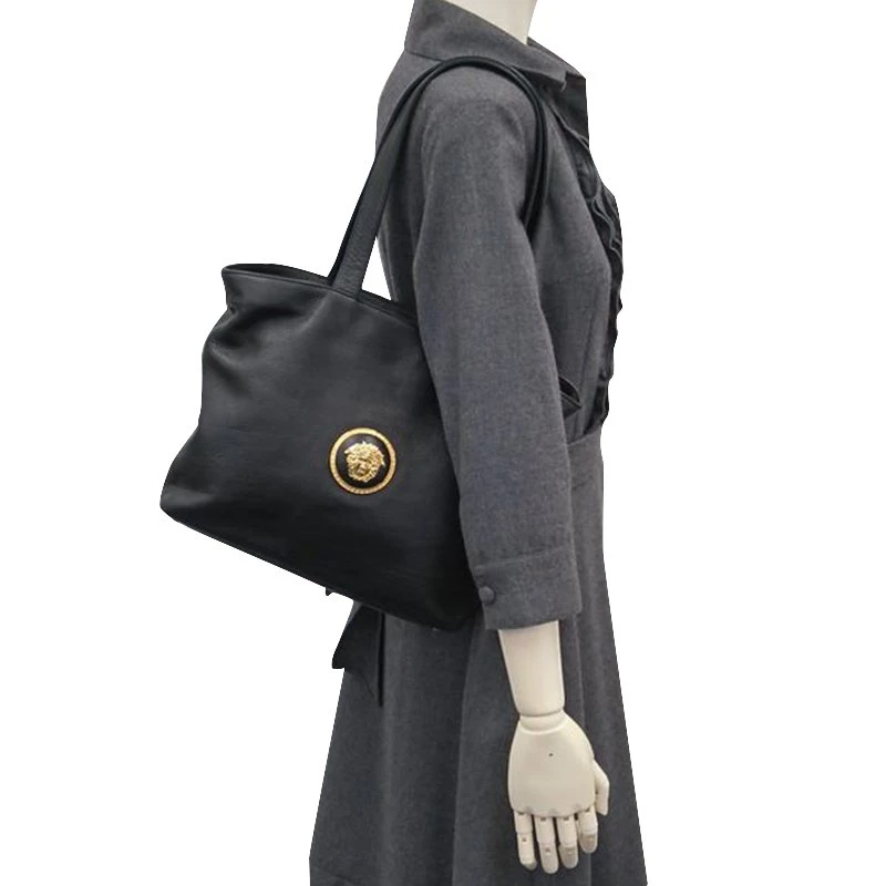 Collect the classic elegance with the Versace Medusa tote, which simply flaunts exquisite craftsmanship. Crafted in black pebbled leather, the bag exudes elegance in the signature metal branding on the front. Featuring shoulder handles, the bag opens with a top zip to a leather lined interior with a metal plaque for branding. The gold tone metal rivets on the base, protects the bag and the overall look exudes elegance.