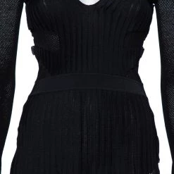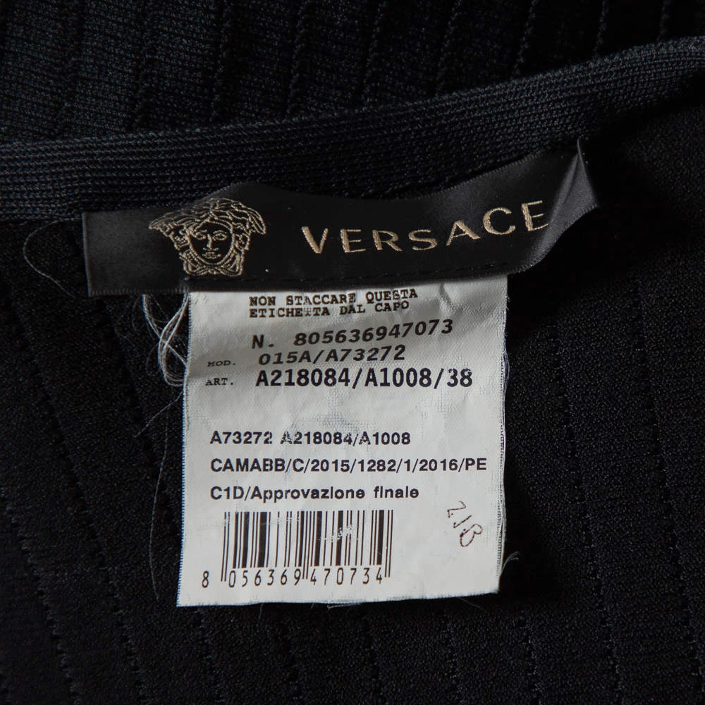 Be at your glamorous best in this sheath dress from the House of Versace! The black cotton blend creation has been styled in a flattering silhouette with perforated knit long sleeves and panels. It has a plunging neckline and will look amazing with pointed stilettoes and a statement clutch.