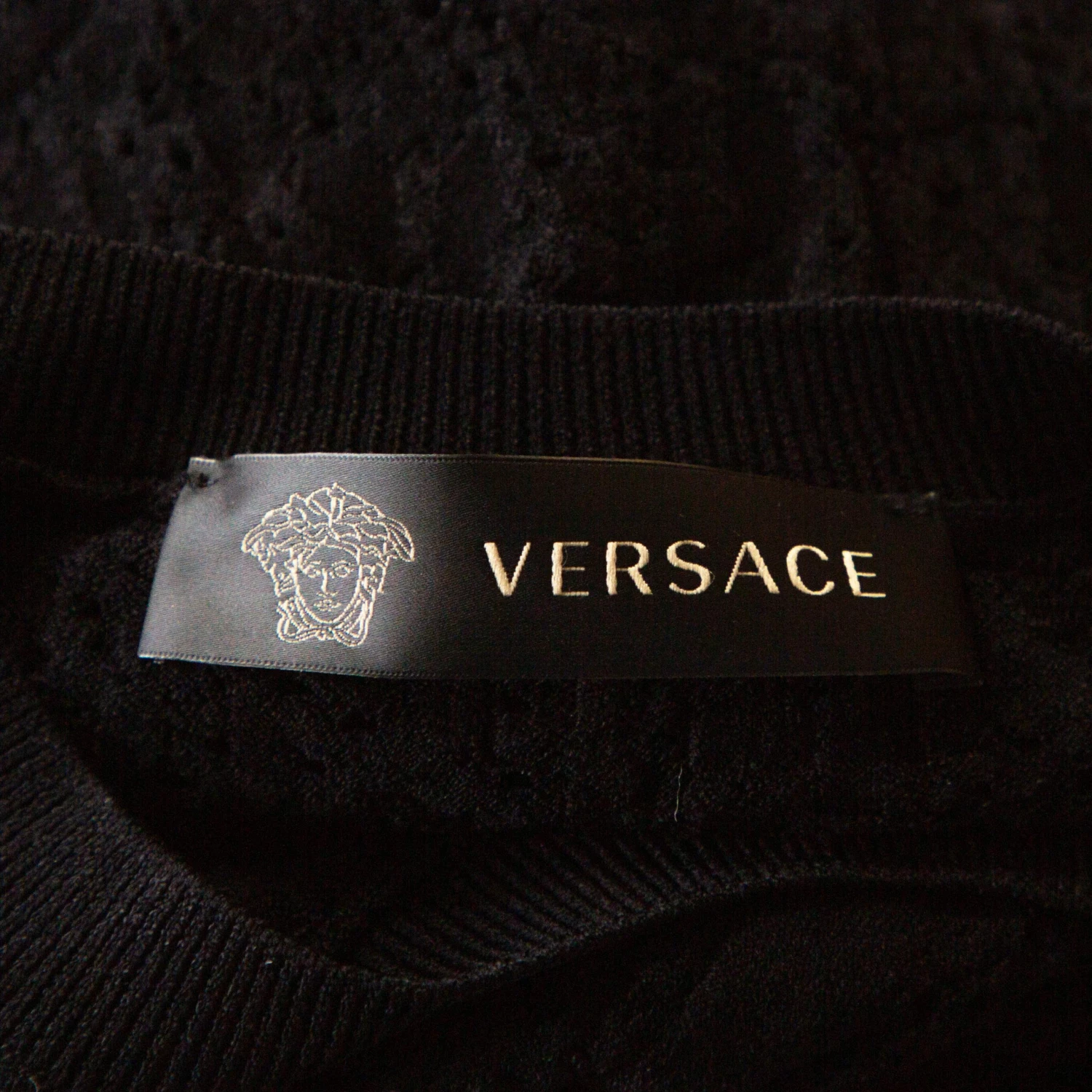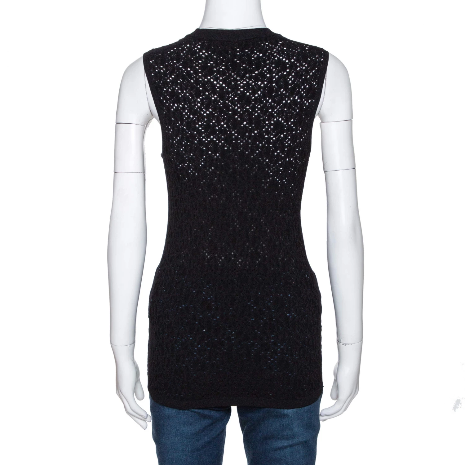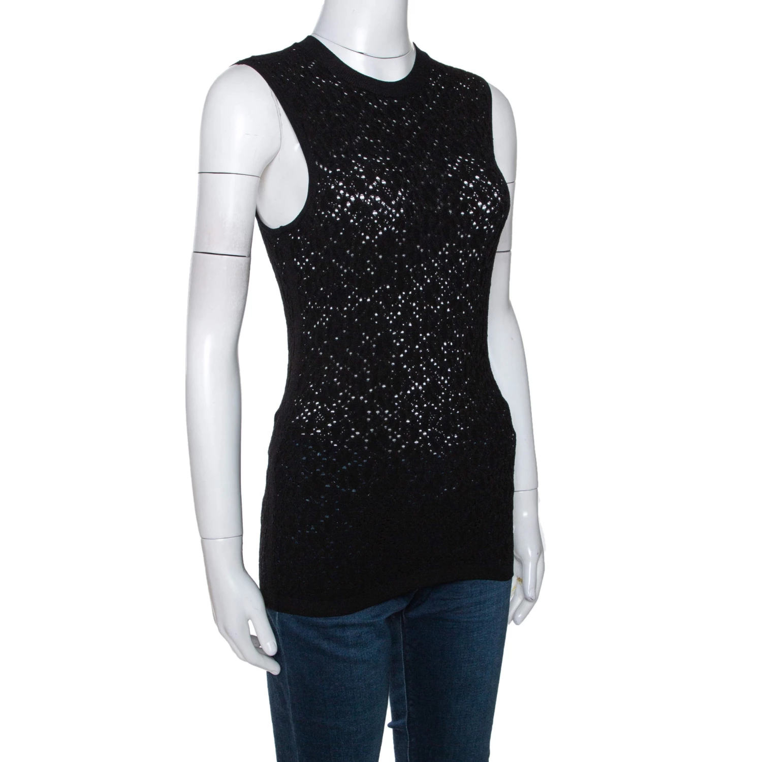 This stylish Versace top is a great example of an elevated essential. Crafted from quality fabrics, this perforated knit top comes in a classic shade of black. It is sleeveless, has a round neck and a fitted silhouette.