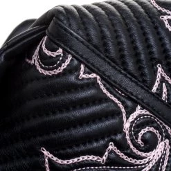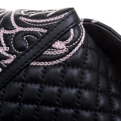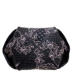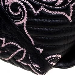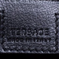 This Versace handbag is simply breathtaking. Meticulously crafted from leather, the quilted bag delights not only with its appeal but structure as well. It is held by a single handle, detailed with embroidery and equipped with a spacious canvas interior. The fabulous shape, the catchy emblem, and the impeccable style of creation effortlessly add to the marvel of this coveted piece.