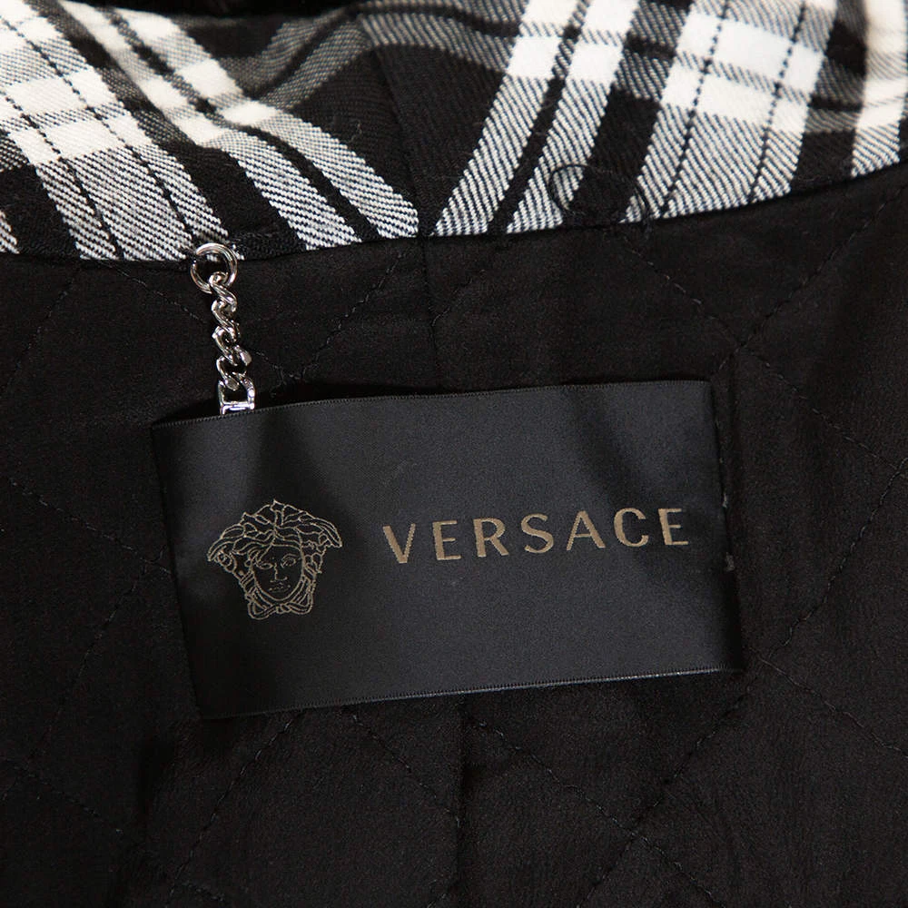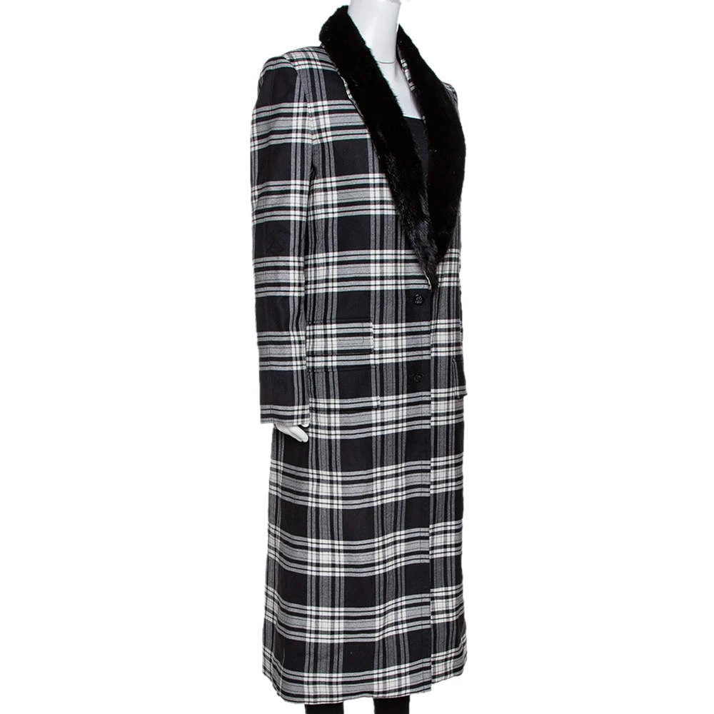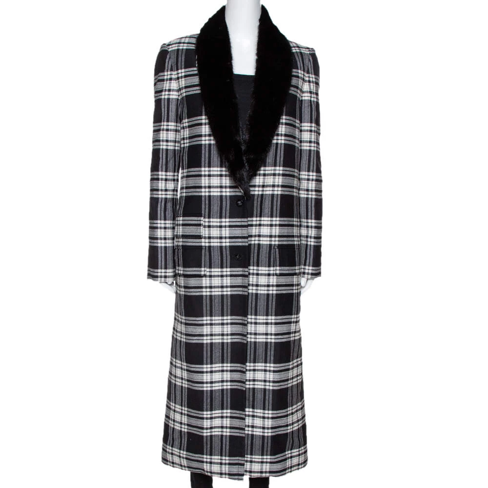 This graceful long coat from Versace is all about luxury and style. This creation is designed from a plaid wool blend and features a shawl collar made from mink fur. It offers full-length sleeves and the signature Medusa logo buttons. Chase away the winter chill wearing this coat.