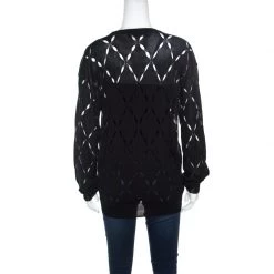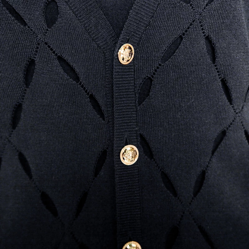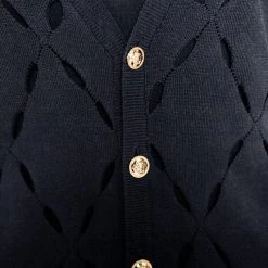 Modishly designed with a feminine approach, this Versace cardigan features pointelle knitting all over. This snug cardigan has a plunging V-neckline with long sleeves along with ribbed hem and cuffs. Layer this over your casual separates to complete the look.