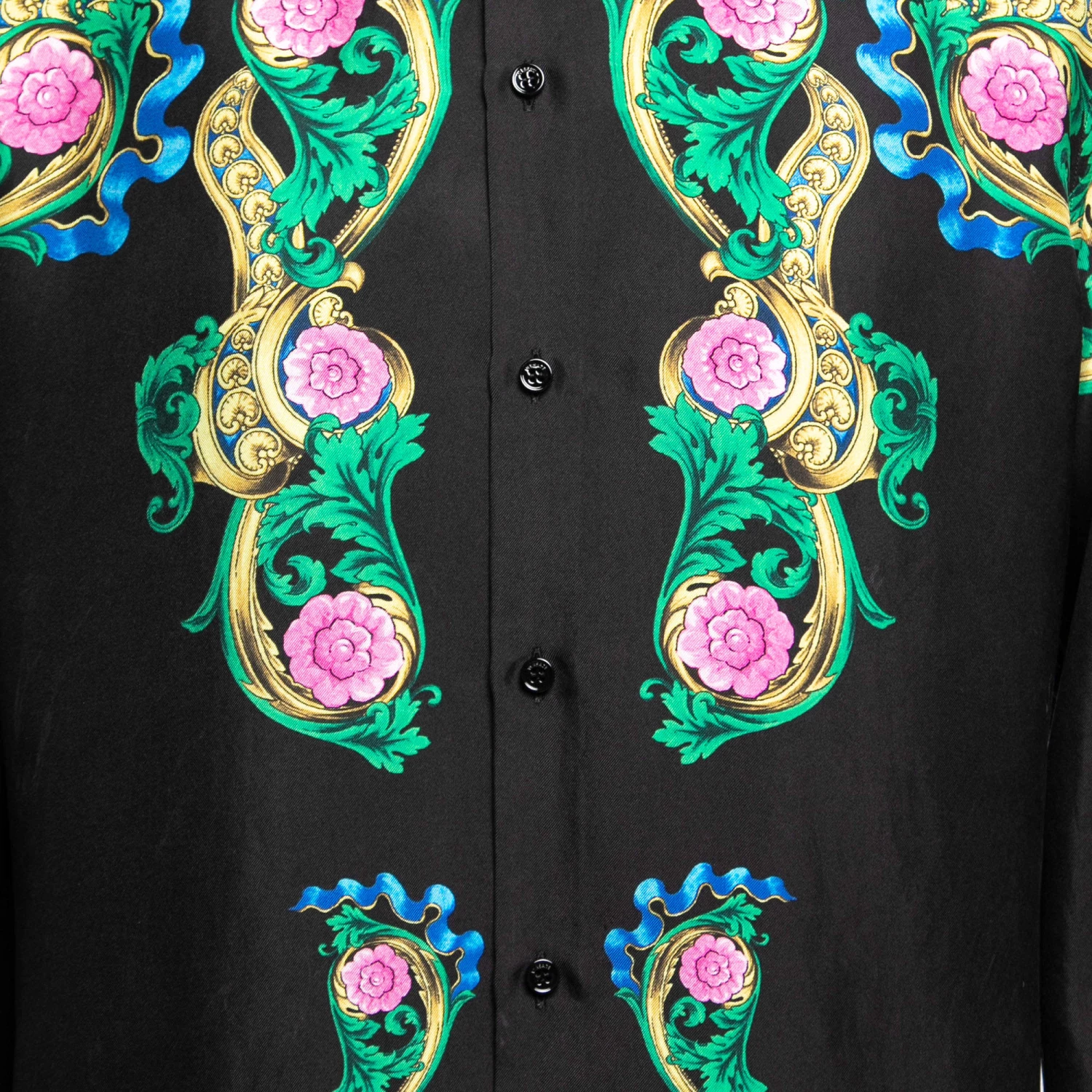 Shirts are an indispensable part of a wardrobe, so Versace brings you a creation that is both versatile and comfortable. It has been tailored from silk in a black shade featuring the floral motifs along the hem, buttons, and cuffs.