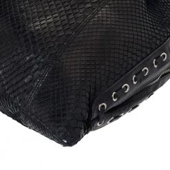 This Versace satchel is designed to deliver exquisite looks and lend a hint of distinguished glamour. Crafted meticulously from exotic python leather, it comes in a classic shade of black that will complement a host of ensembles. It is styled with a single handle that is connected to the bag with a series of rings. It is further finished iwth silver-tone hardware detailing that contrast well with the black exterior. It is finished with a spacious satin-lined exterior. (Available for UAE Customers Only)