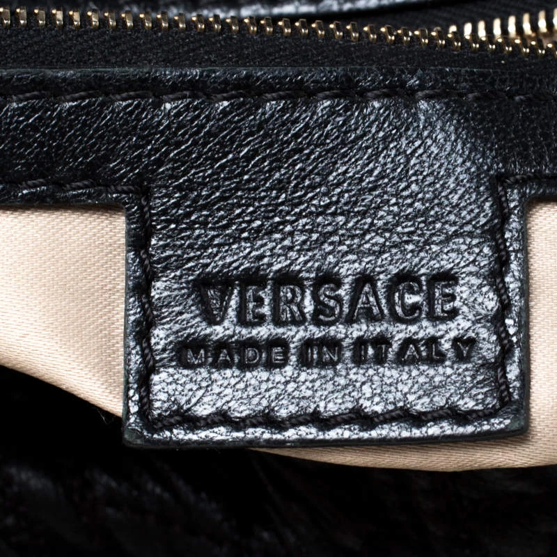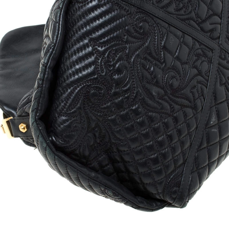 This Versace handbag is meticulously crafted from quilted leather. The Barocco bag delights not only with its appeal but structure as well. It is held by a single handle, adorned with a lovely embroidery all over and equipped with a spacious satin interior. The unique shape, the notable Medusa logo at front in gold-tone, and the impeccable style effortlessly add to the marvel of this coveted piece.