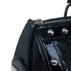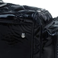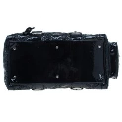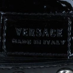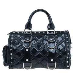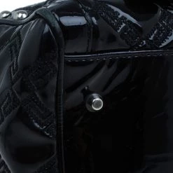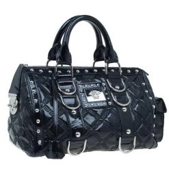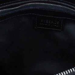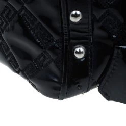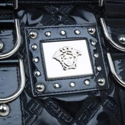 This over the top Versace ‘Snap Out of It’ satchel is a bold statement making bag from the fashion forward Italian label. Crafted from black quilted Versace logo patent leather, it is accented with black braided handles, a flap pocket on the left side, a Medusa-embossed silver-tone plate, and silver-tone studs and D-rings. The zip-enclosed interior is lined with black canvas and features a zip pocket.