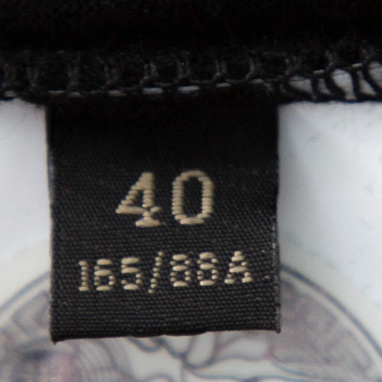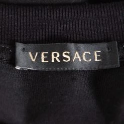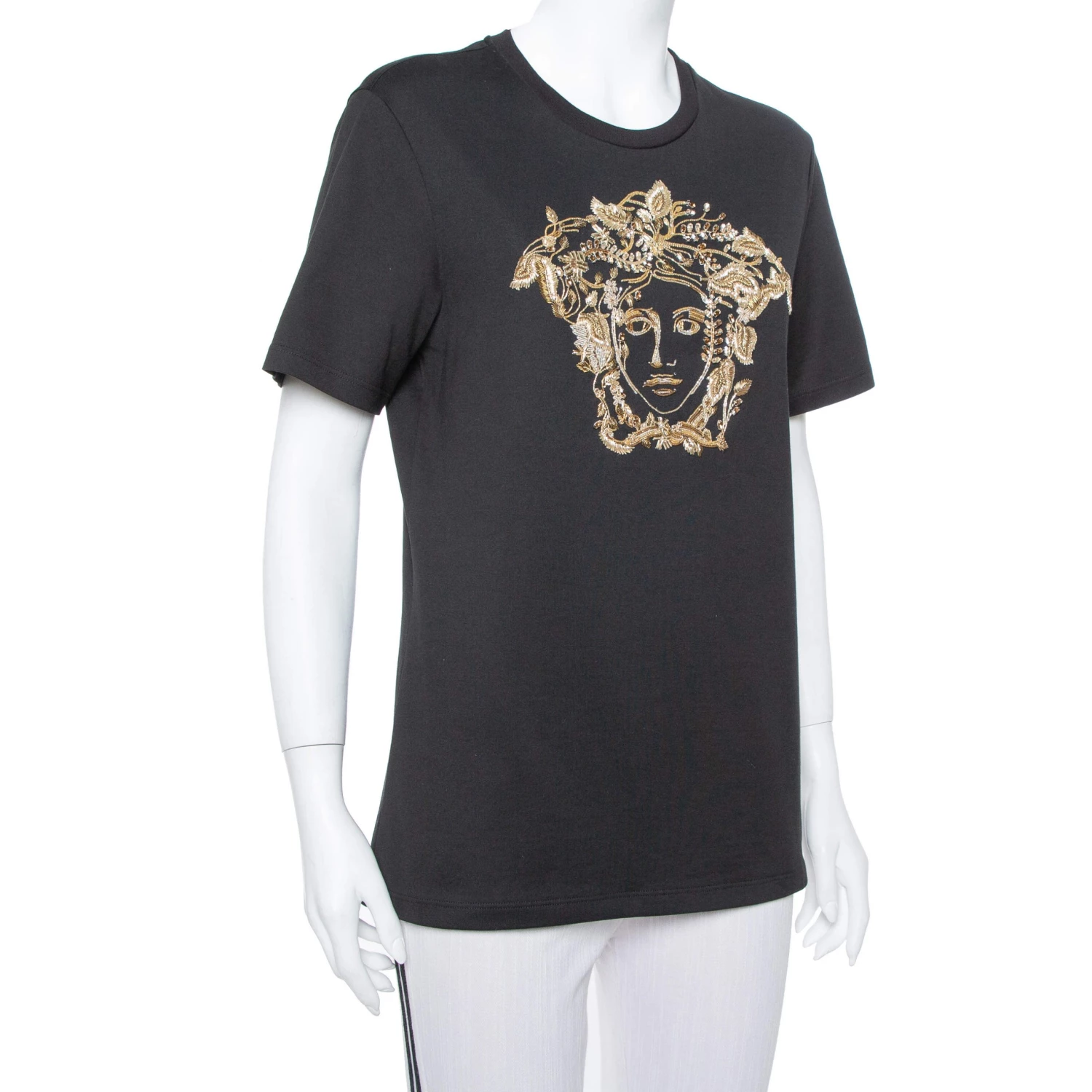 Blending contemporary aesthetics with timeless styles, creations from Versace are amazingly stylish. This black T-shirt comes made from 100% cotton and exhibits the iconic Medusa logo at the front, beautifully embellished with rhinestones. It flaunts a crew neck and short sleeves. Sure to lend you a fantastic fit, it will look great with distressed denims and pointed stilettoes.