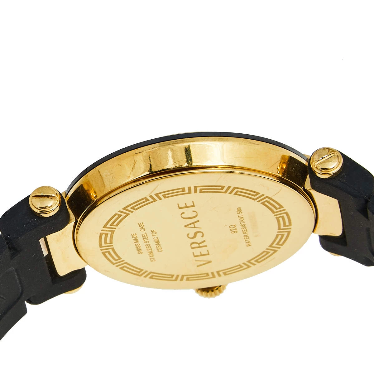 This Versace quartz watch is an ideal choice for everyday use. Made from rose gold-plated stainless steel, it features a ceramic bezel, a round case set with a black dial, and a comfortable rubber bracelet.