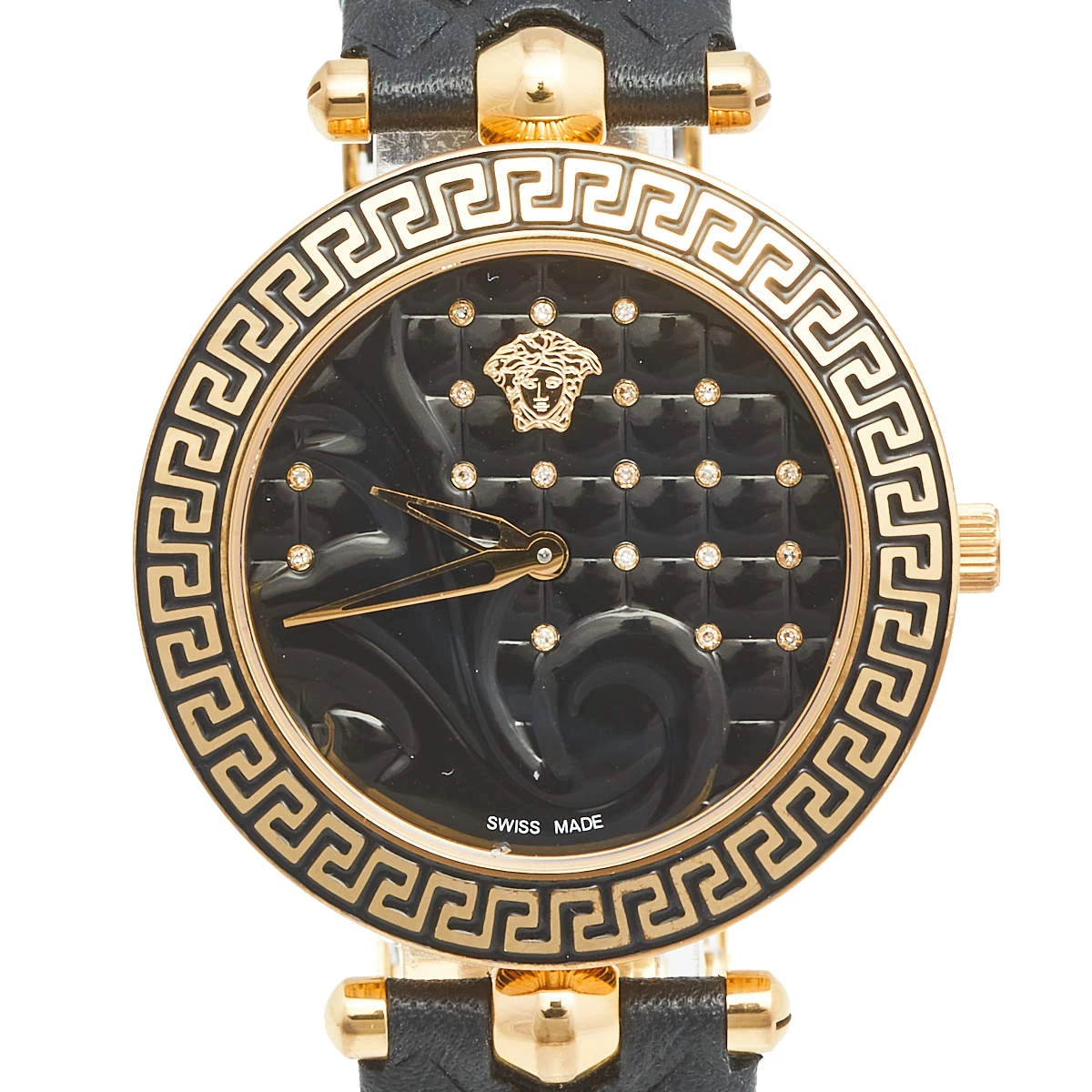 This wristwatch is a member of the famous “Vanitas” collection from Versace. The black and gold colors on this watch create a hard-to-miss look. The watch is made from stainless steel and held by quilted-studded leather straps. The bezel features Greca engravings and the baroque-inspired dial continues the theme of gold studs and the instantly recognizable Medusa logo. It is secured by an engraved clasp fastening.