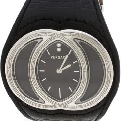 Pair this Versace wristwatch with your casual outfits for a sleek finish. This watch comes with a stainless steel interlocking bezel, index markers and the Versace brand name. The leather strap fixes on the wrist with a deployment clasp closure. The guilloche dial is protected with sapphire crystal glass and houses two diamonds.
