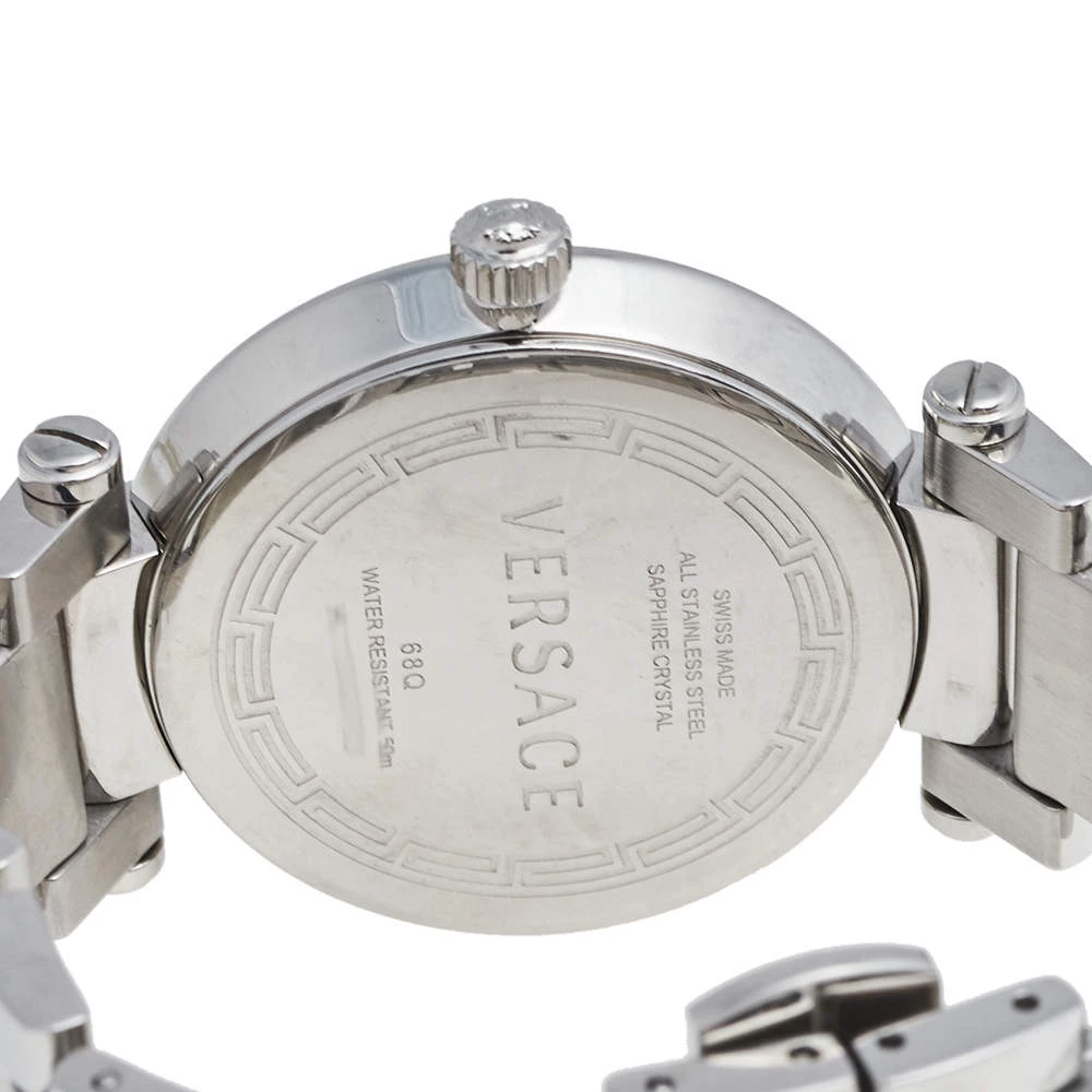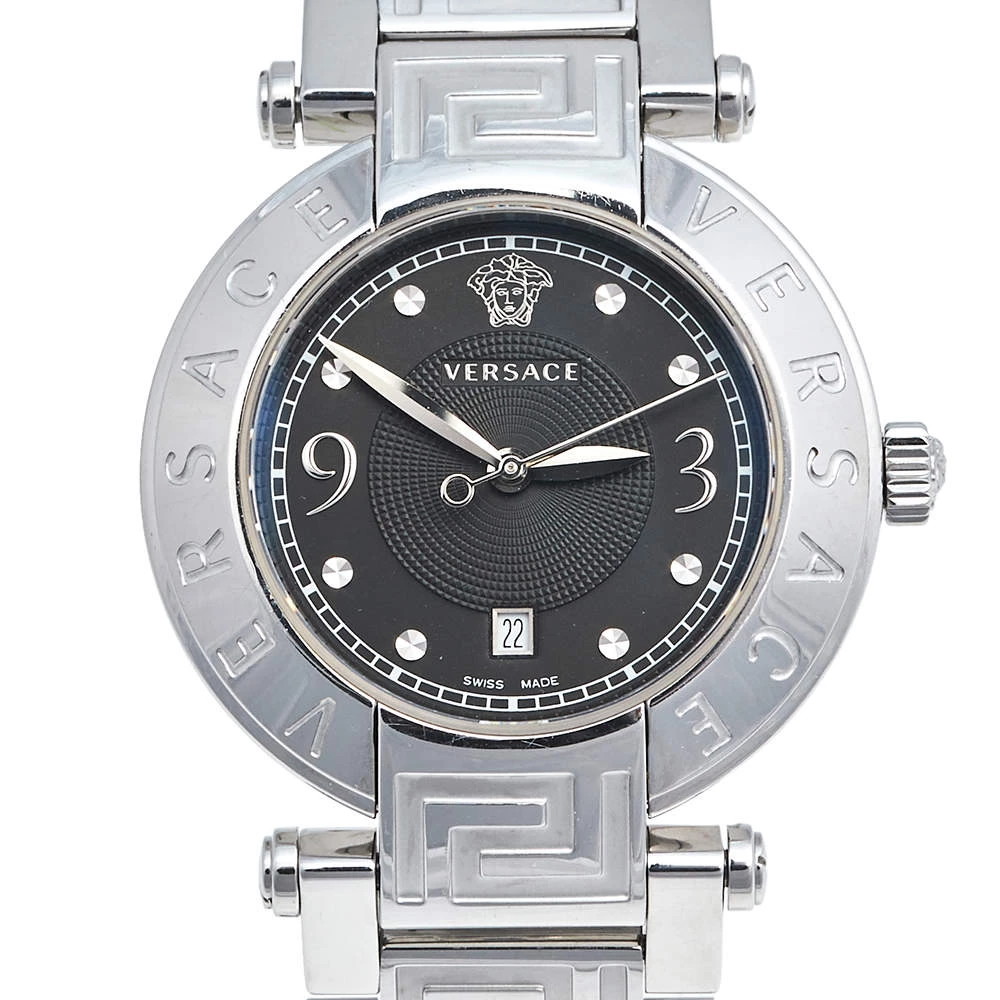 Beautifully designed with the signature Greca pattern of Versace, this Reve timepiece is perfect to add a distinctly stylish and luxurious look. Constructed in stainless steel, this watch features a brand-name carved bezel and black dial with a date window and the Medusa logo to complete the look.