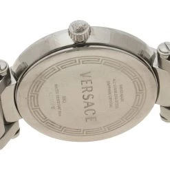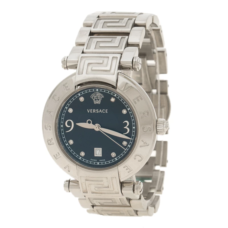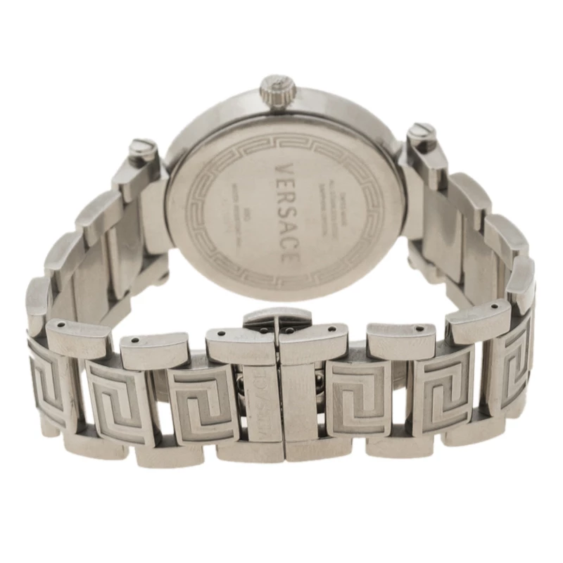 Beautifully constructed in the most eye catching patterns from the house of Versace, this Reve timepiece is perfect to add a distinct stylish and luxurious look. Constructed in stainless steel, this watch features a brand name carved bezel and black dial with diamond studded hour markers to complete the look.