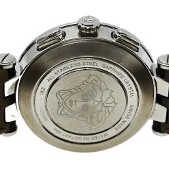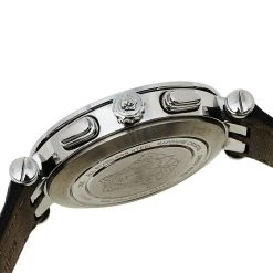 The interchangeable bezel accented with signature details is the highlight of this watch from Versace. This elegant wristwatch has a round stainless steel case that is held by leather straps, secured by a simple closure. The round dial is adorned with index hour markers, three sub-dials, and a small date window at the 4 o’clock position. Make this timepiece your everyday style companion.