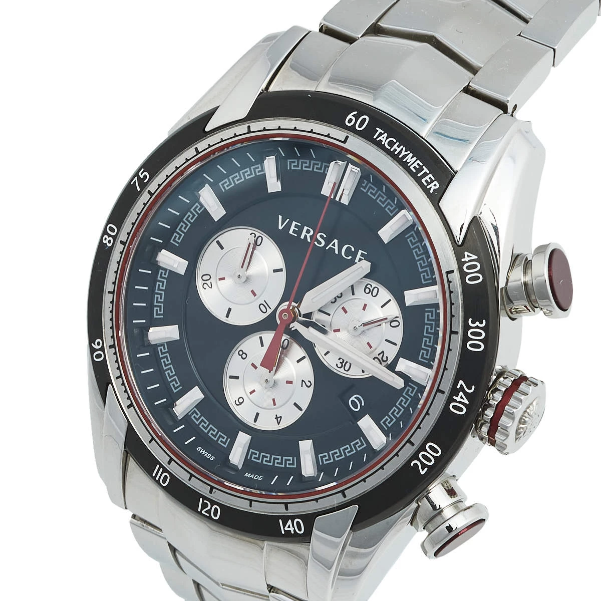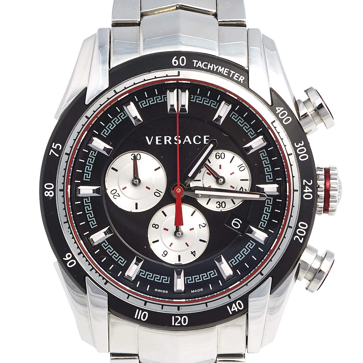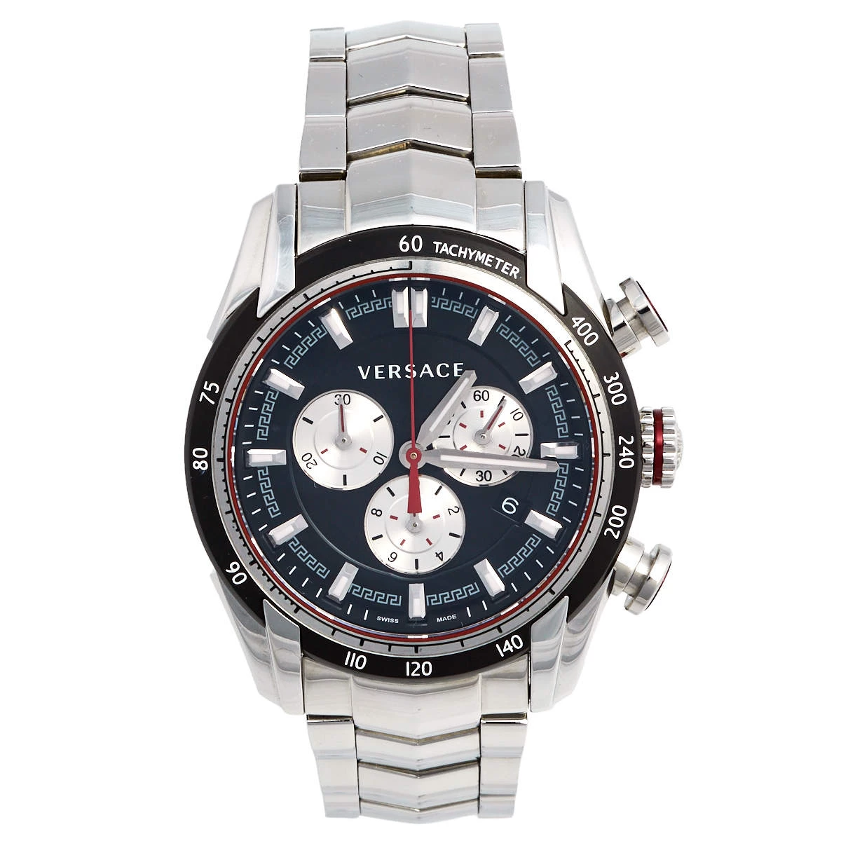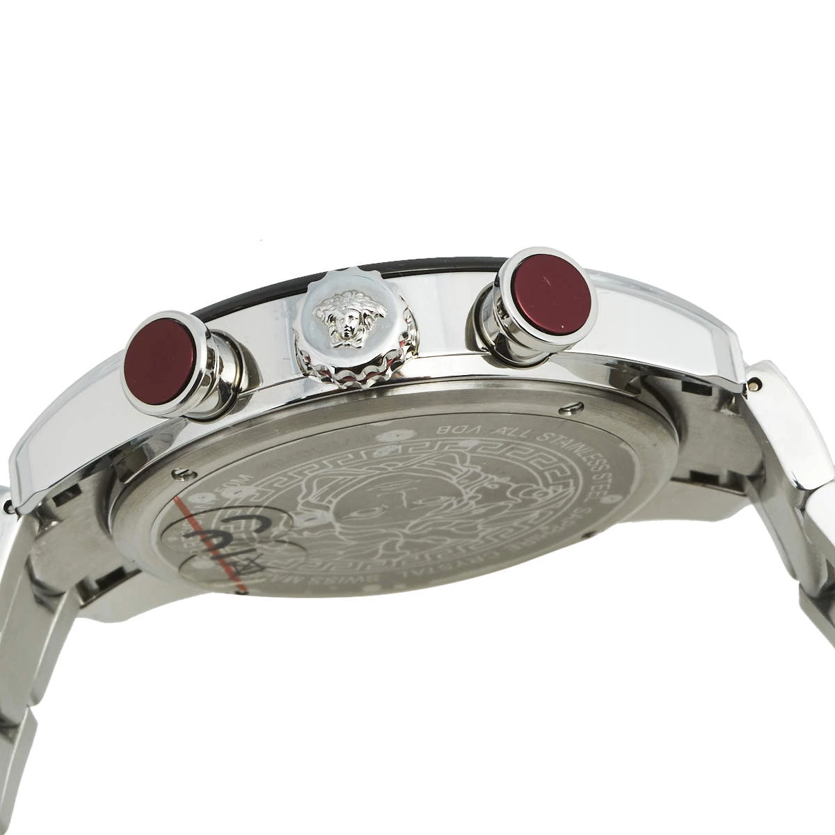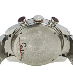 Elegant appeal is the highlight of this watch from Versace. This wristwatch has a round stainless steel case which is held by stainless steel chainlink bracelet, secured by a push-lock fastening. The round dial is adorned with subdials, index hour markers with a small date window at 4 o’clock position. Make this timepiece your everyday style companion.