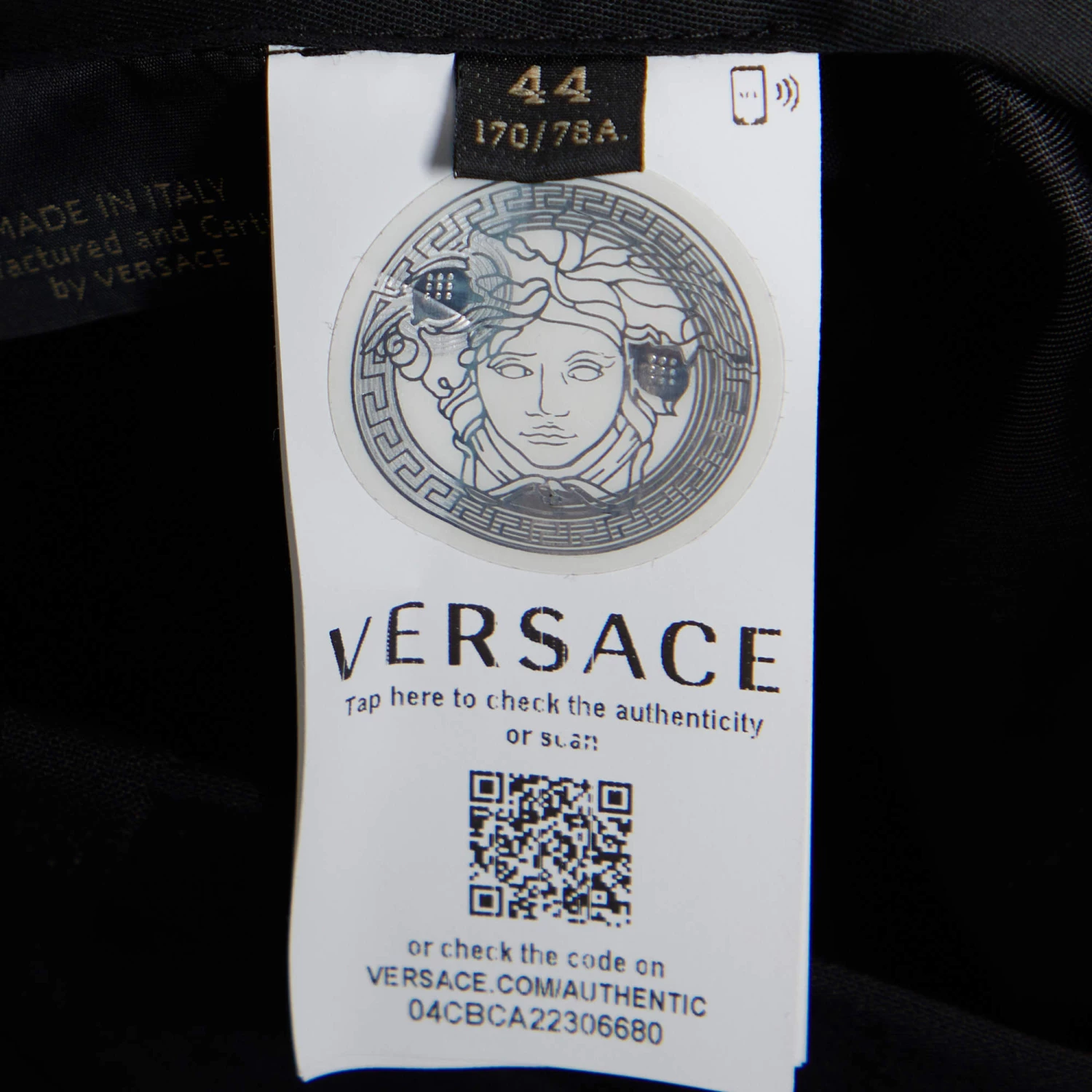Classy, comfortable, and sartorially smart, these trousers from the House of Versace are definitely closet-essential. Featuring a tailored fit, they are stitched using black stretch wool fabric and are equipped with a zip-type closure and two functional pockets. Flaunt a stylish formal look by wearing these Versace trousers.