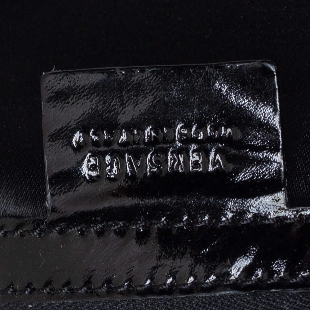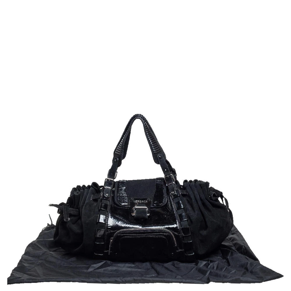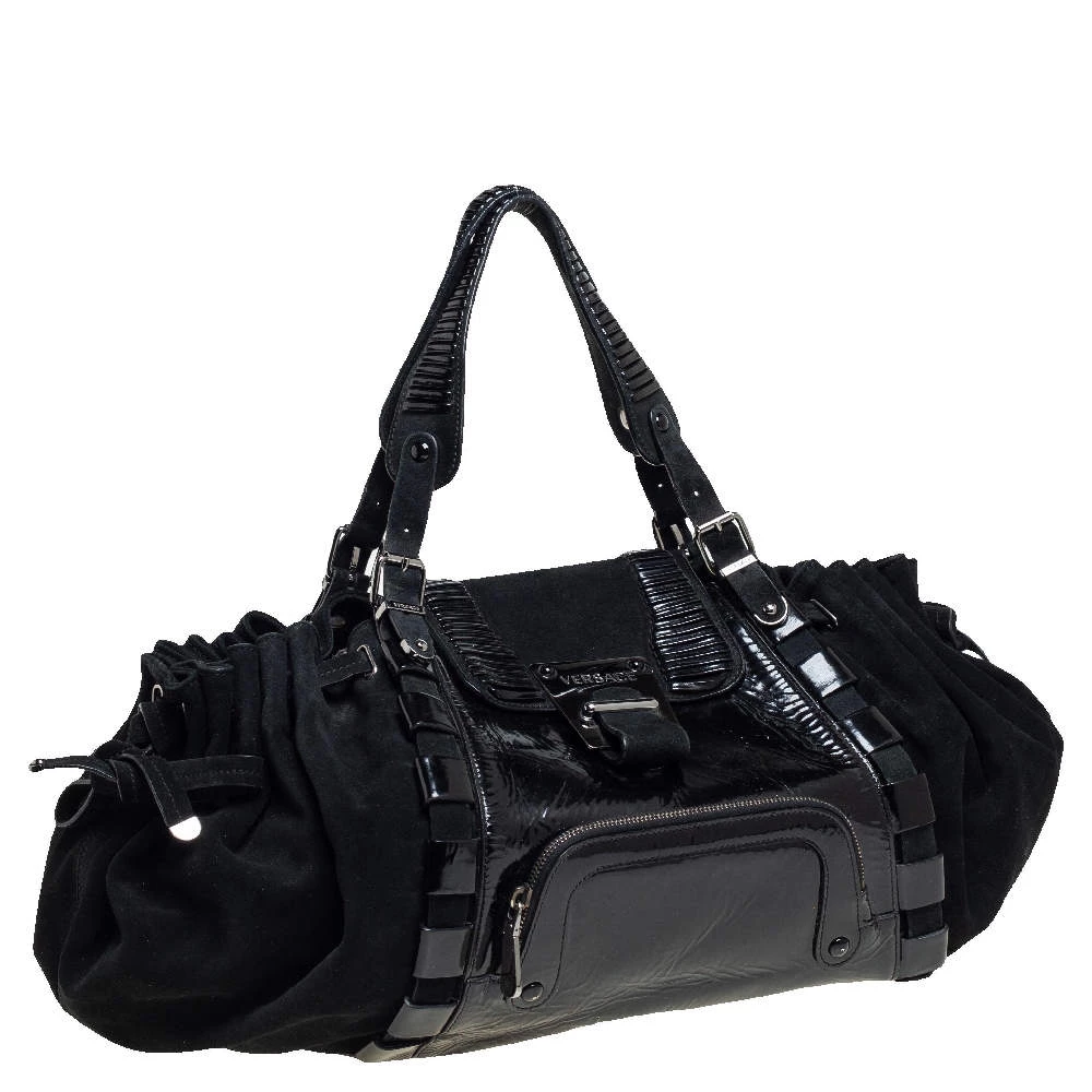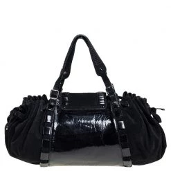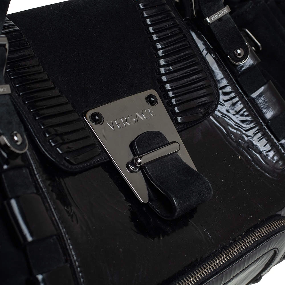 Coming from the house of Versace, this satchel is a dream come true for every fashionista. Give yourself a luxurious look with this suede and patent leather bag. It comes with a satin-lined interior, dual handles with buckle detailing, gunmetal-tone hardware, and impeccable finishing.