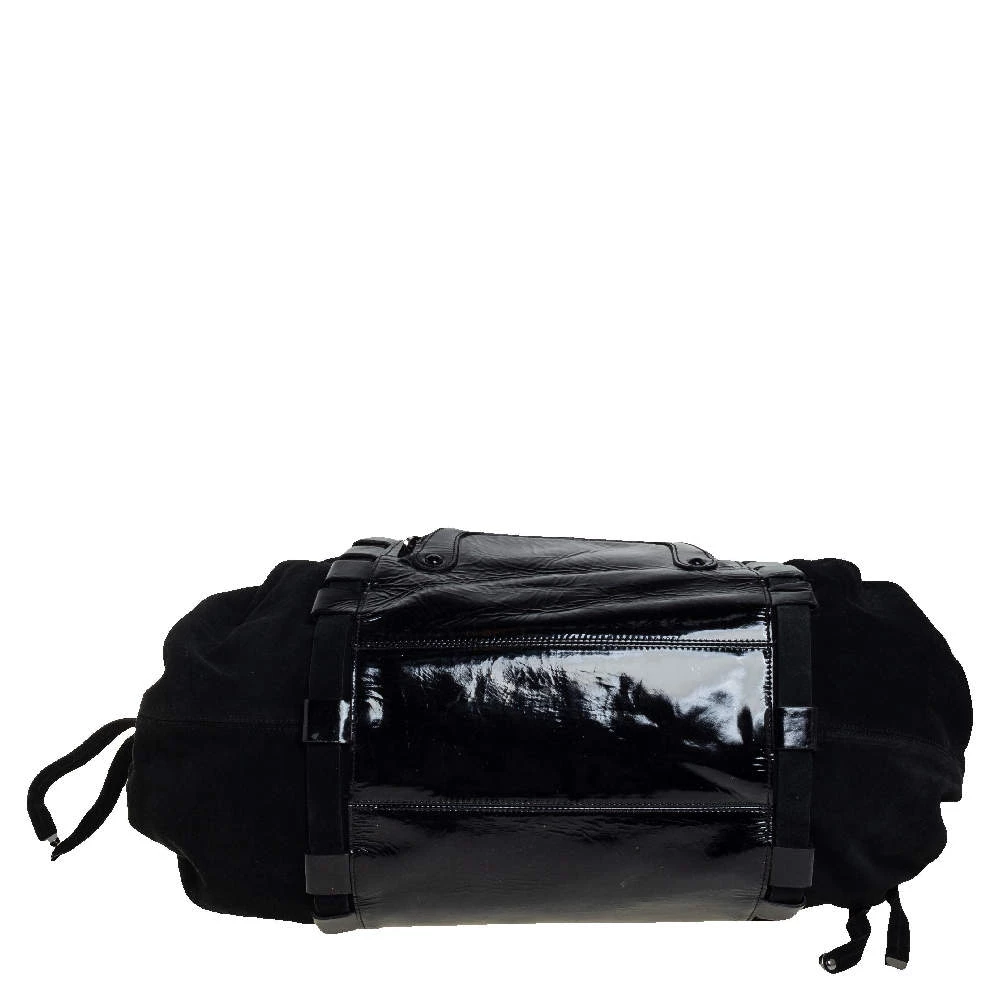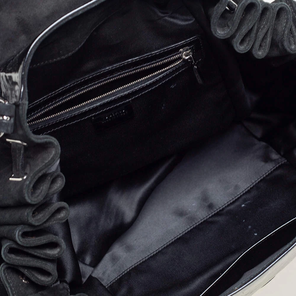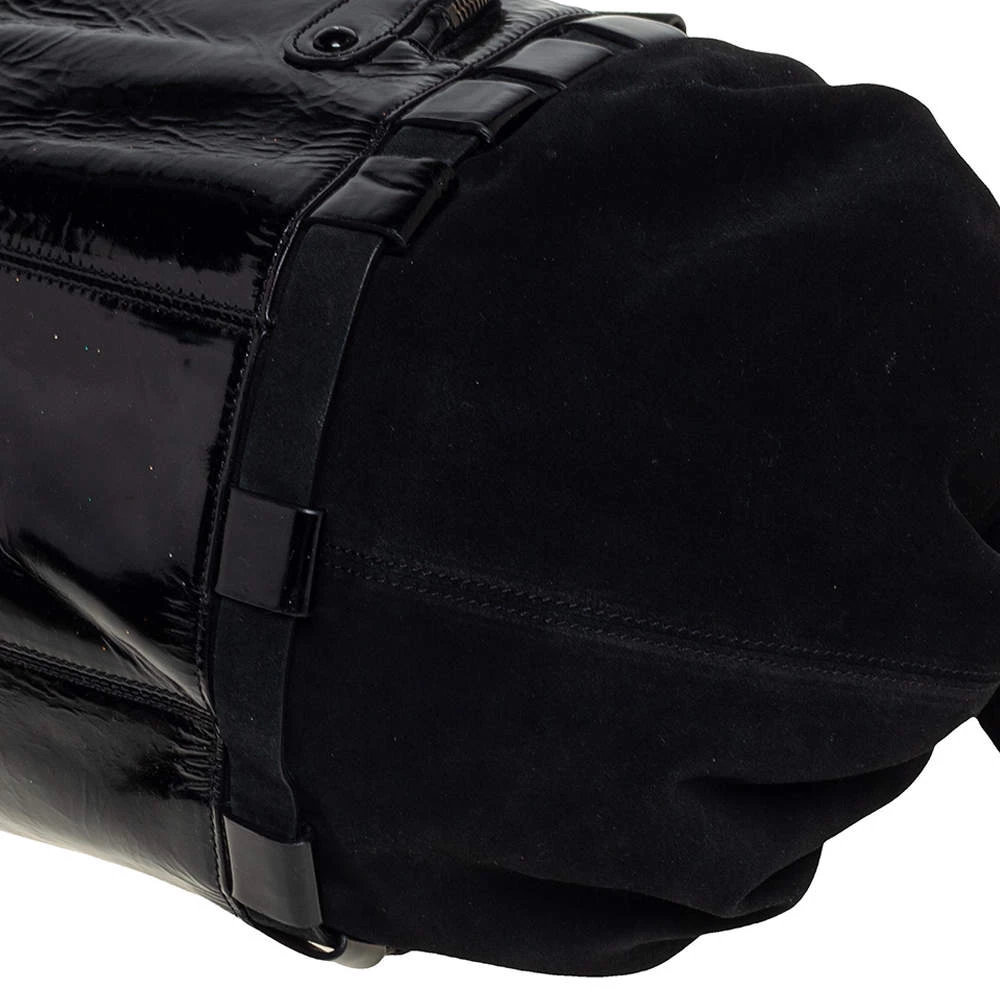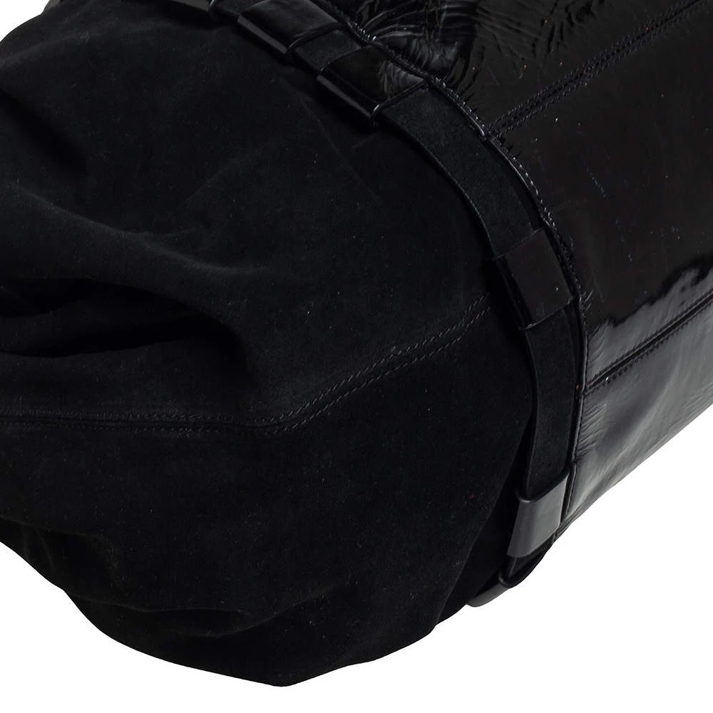 Coming from the house of Versace, this satchel is a dream come true for every fashionista. Give yourself a luxurious look with this suede and patent leather bag. It comes with a satin-lined interior, dual handles with buckle detailing, gunmetal-tone hardware, and impeccable finishing.