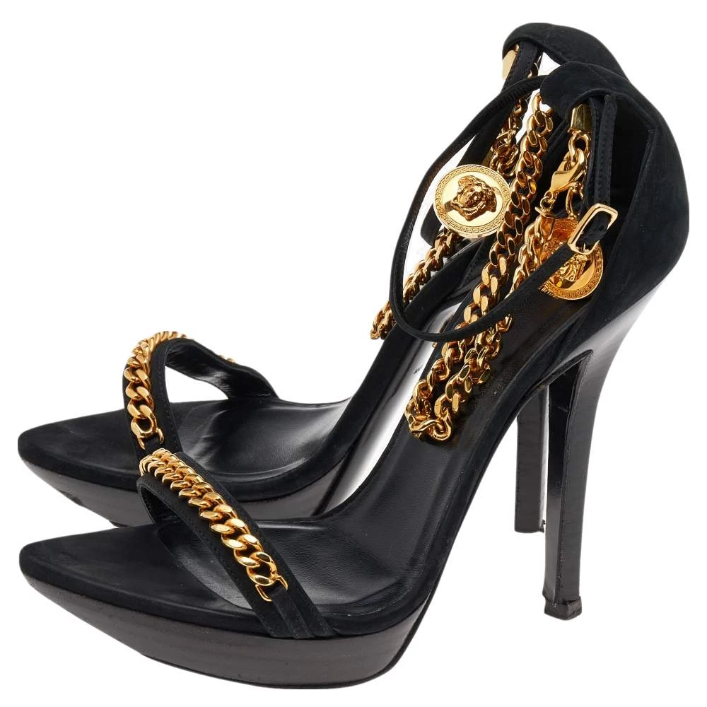 Inspired by the historical and signatory motifs of the House, these sandals from Versace accurately justify the label’s skilled flair and vintage aesthetic. They are crafted from black suede and augmented with gold-toned Medusa motifs and chain details on the upper. They are completed with 13 cm heels.