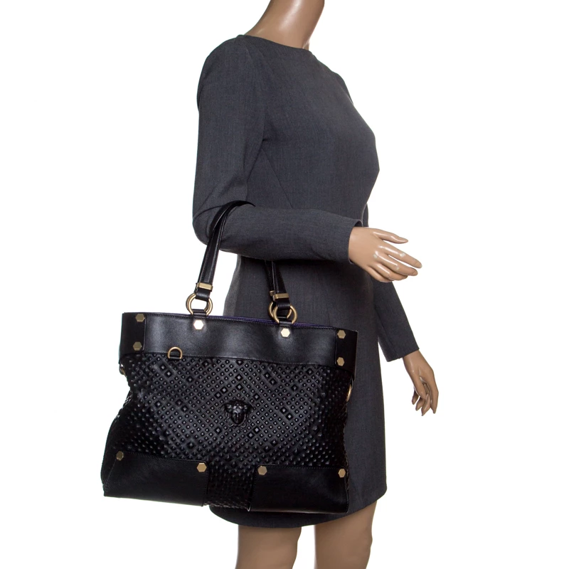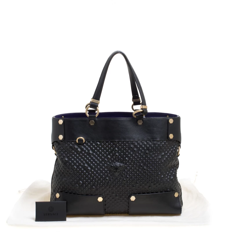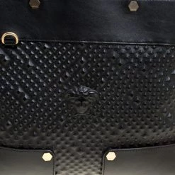 This Medusa tote from Versace is a fabulous piece. The bag comes in a luxurious black exterior made from textured leather and designed with their signature Medusa on the front and a spacious satin interior. It features dual top handles, gold-tone hardware and protective feet at the bottom. High on appeal and effortlessly stylish, this tote deserves to be in your arms.