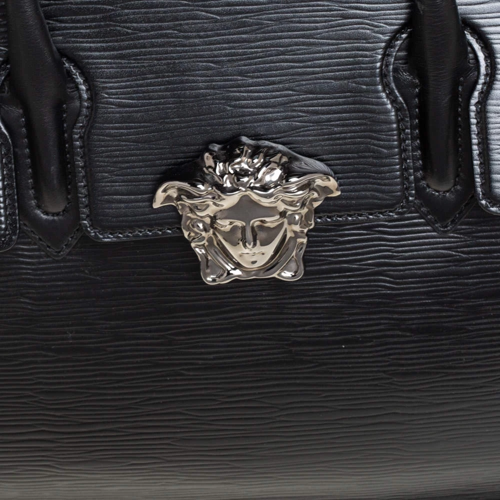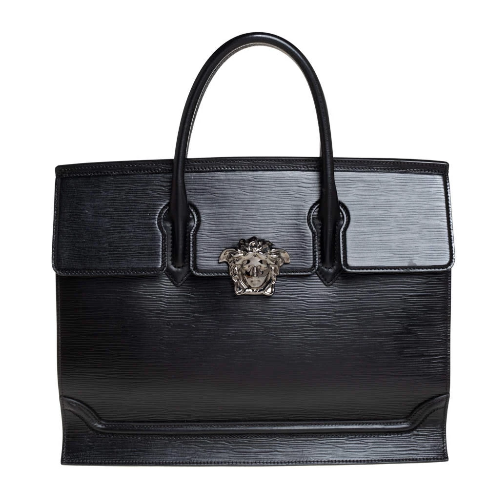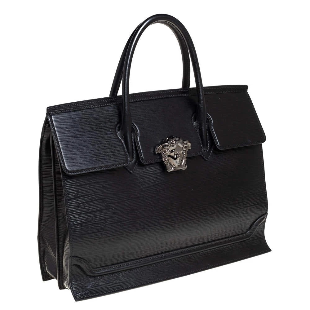 This Palazzo Empire tote from Versace is just amazing! Exhibiting a chic persona, it comes crafted from black textured leather and features a front flap that carries the iconic Medusa motif. It opens to a canvas interior that can graciously accommodate your basic essentials. Equipped with dual top handles and a detachable shoulder strap, it is sure to be an investment-worthy buy!