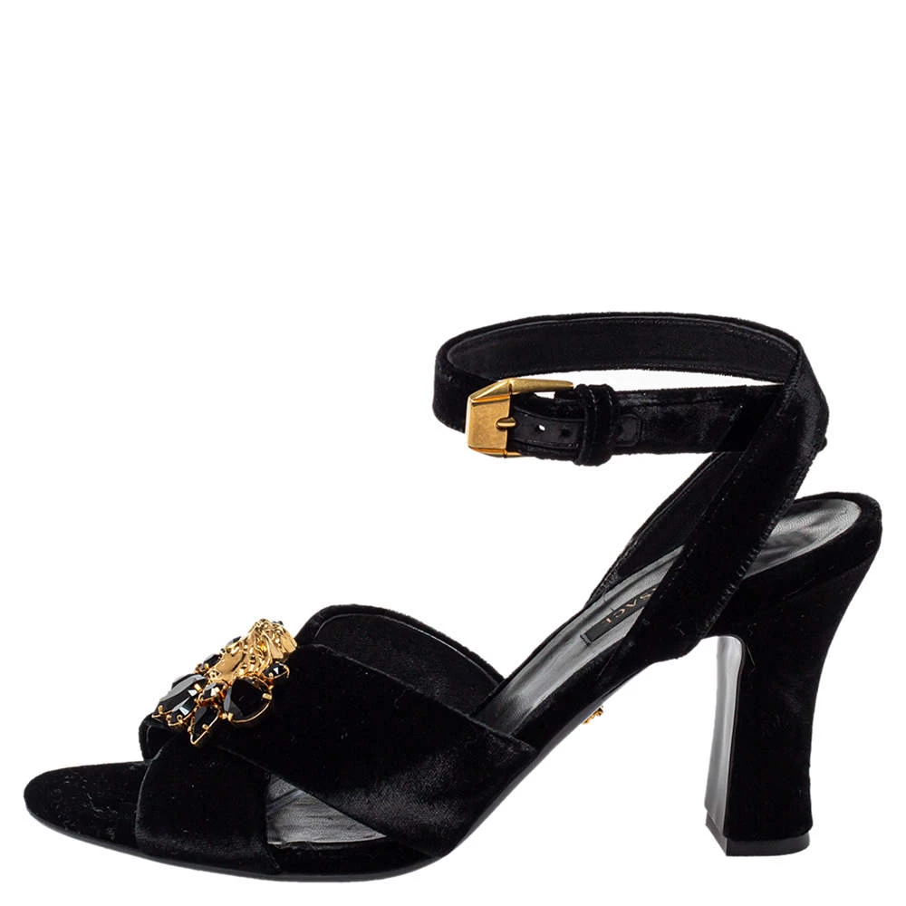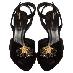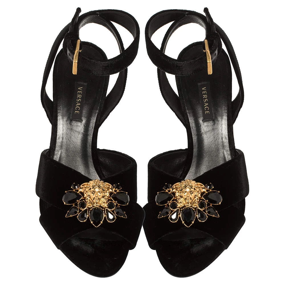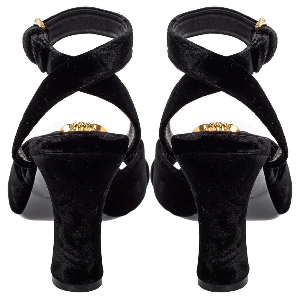 These gorgeous Versace sandals will adorn your feet in the most effortless way. Crafted from black velvet, they feature the iconic Medusa logo embellished with crystals on the front. The sandals are elevated on 9 cm heels and secured with ankle straps.