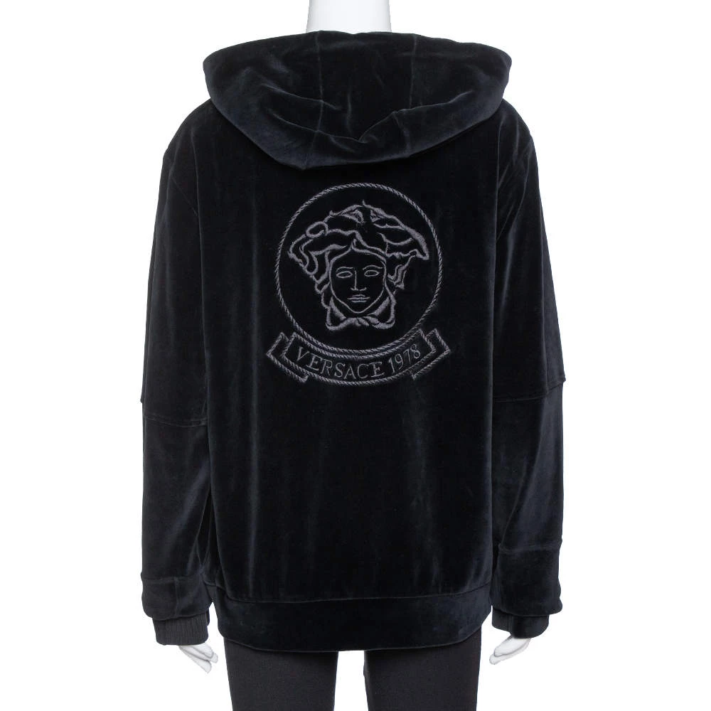 This hoodie by Versace is a closet staple. Crafted from velvet, it comes in a shade of black. This creation features a zipped front, pockets and Medusa embroidery. It has been cut to deliver a comfortable fit.