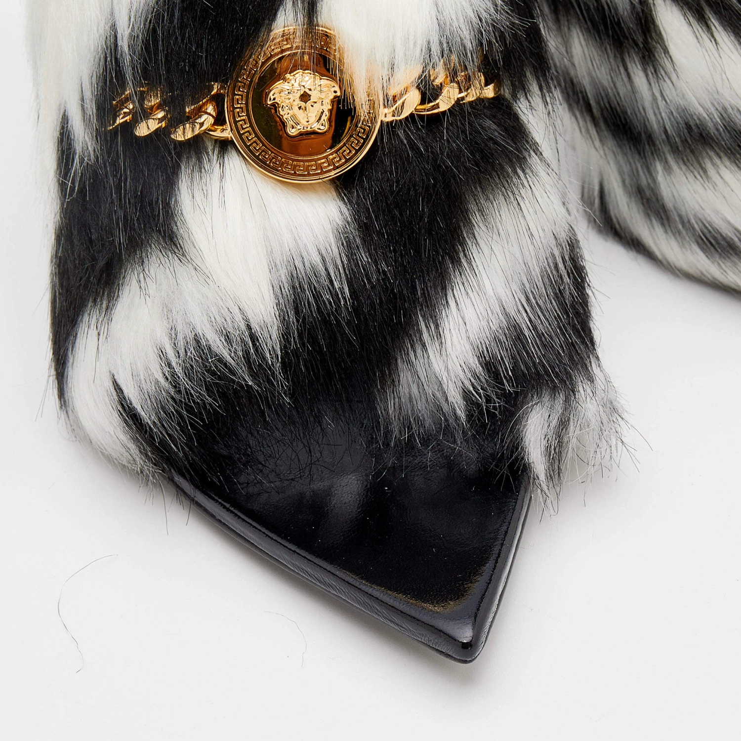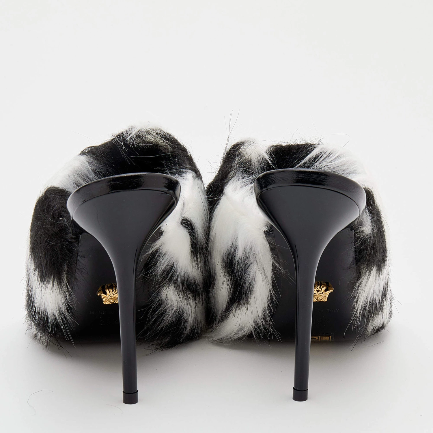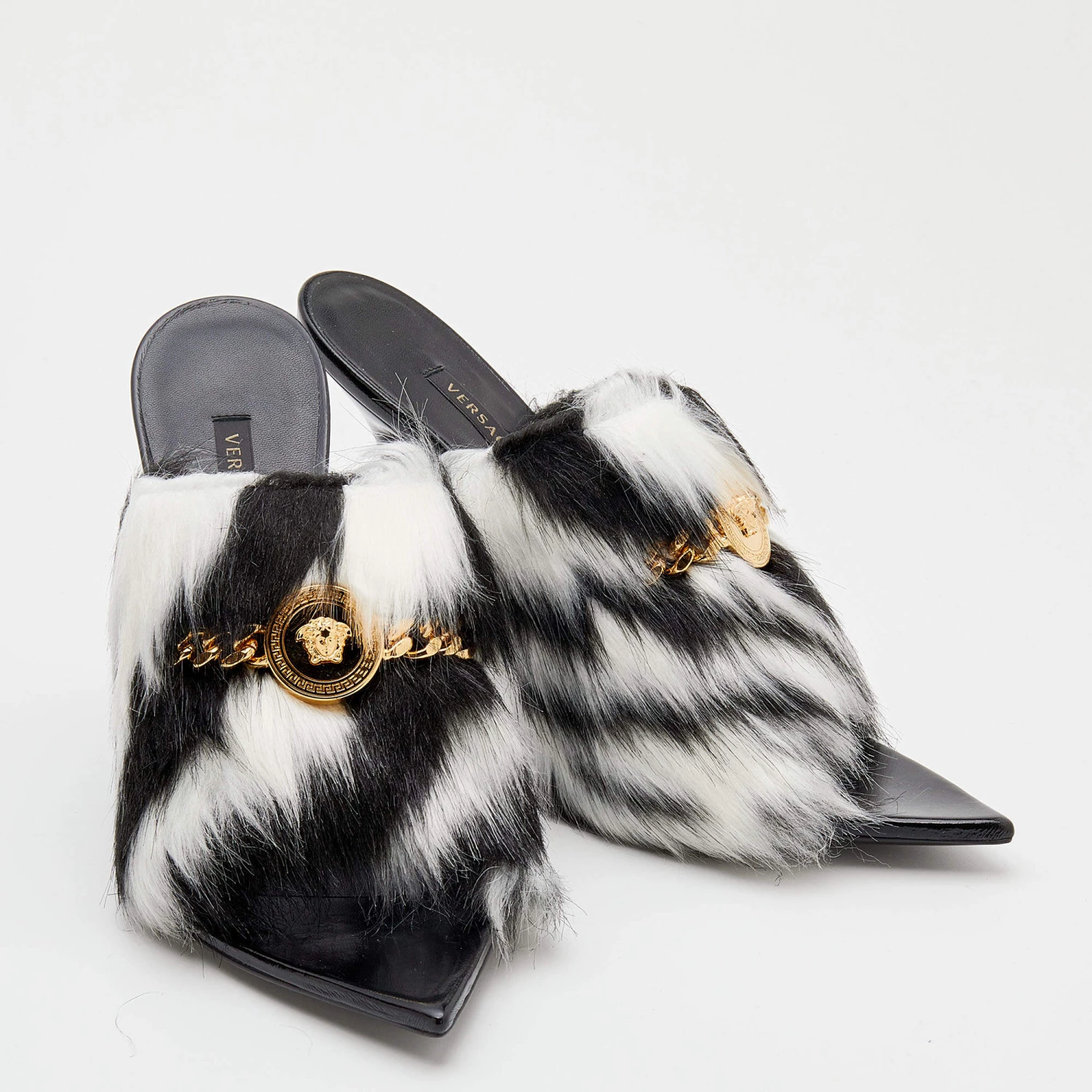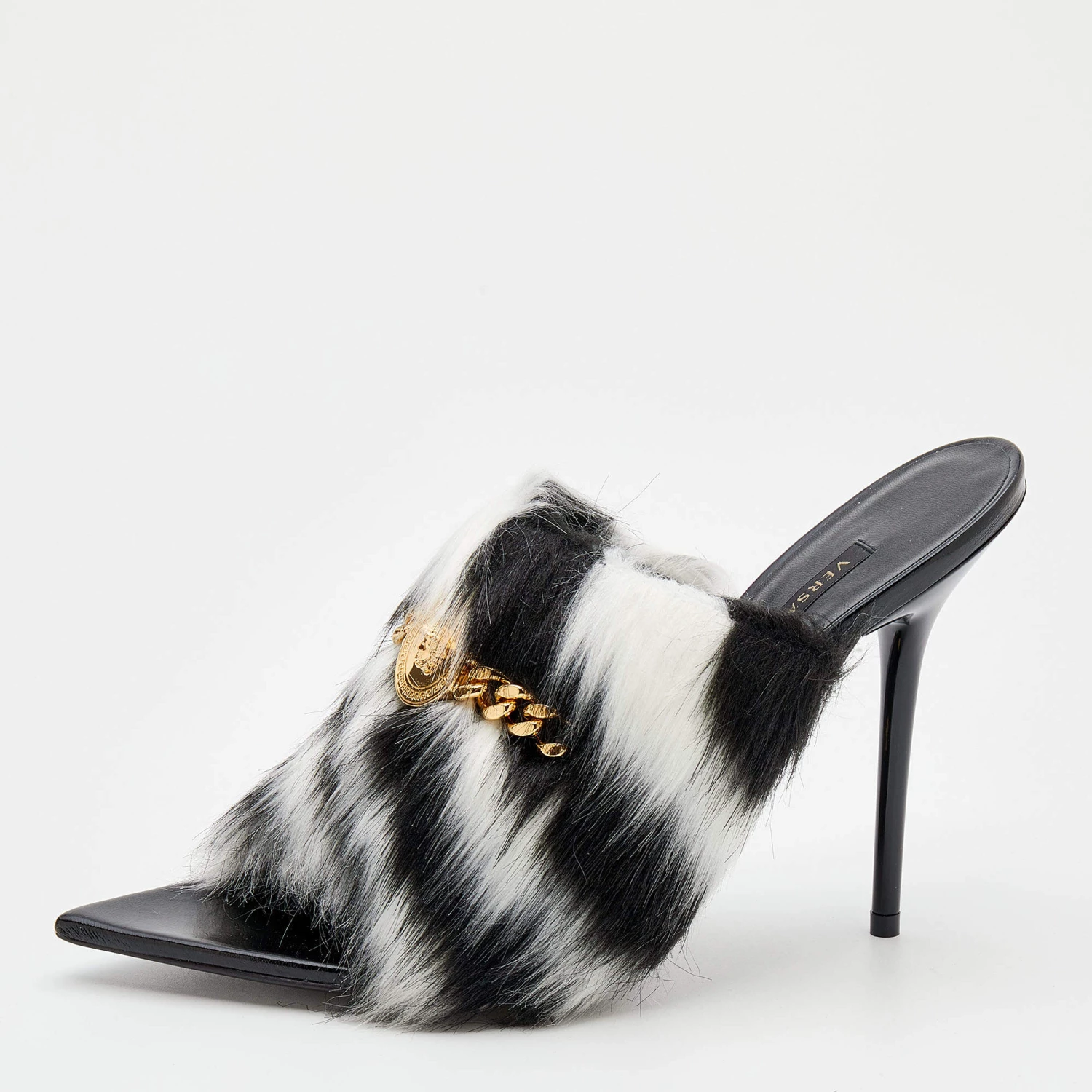 Crafted using faux fur and leather, these Versace sandals are meant to add a sophisticated finish to your look of the day. The designer shoes feature pointed tips, gold-tone metal accents, and 12 cm heels.