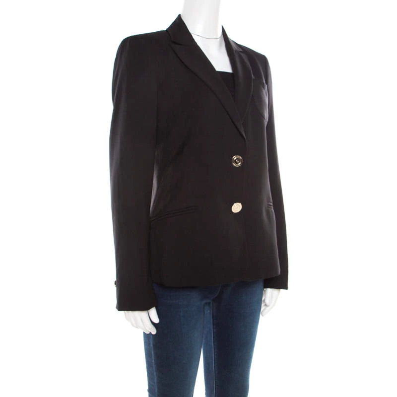 The sophisticated blazer from Versace offers comfort without compromising on style. The gold-tone logo buttons add a lovely touch to the amazing piece. Tailored from wool, this black blazer can be worn with trousers or over a dress.