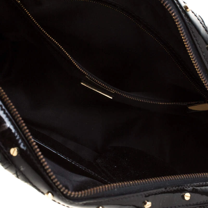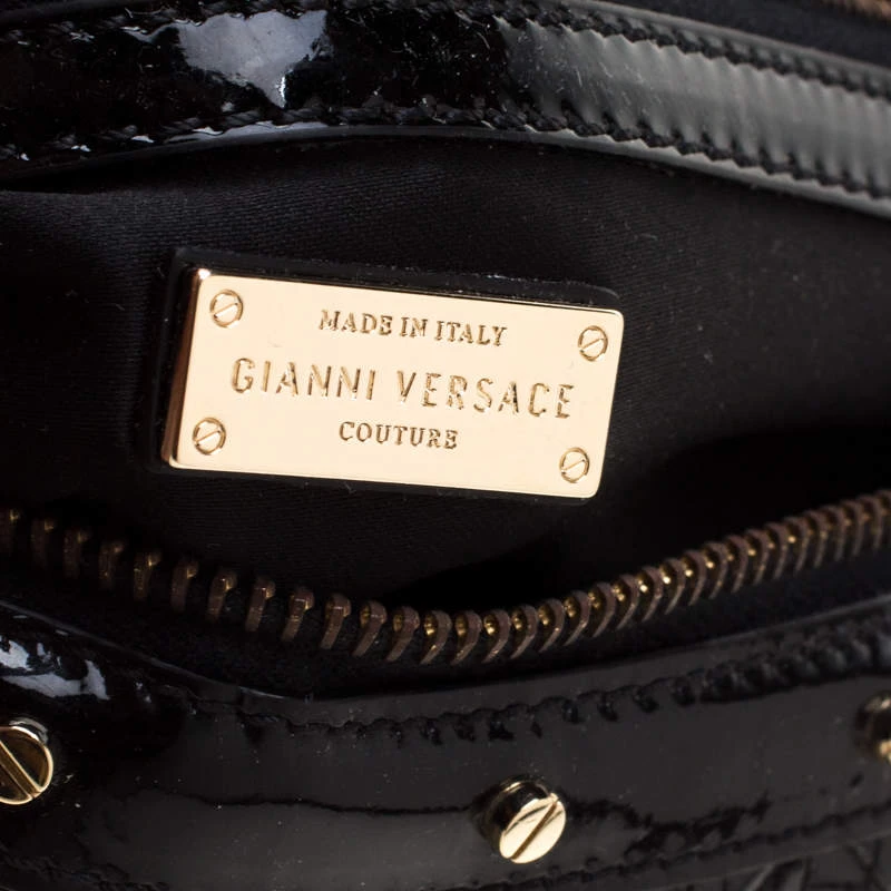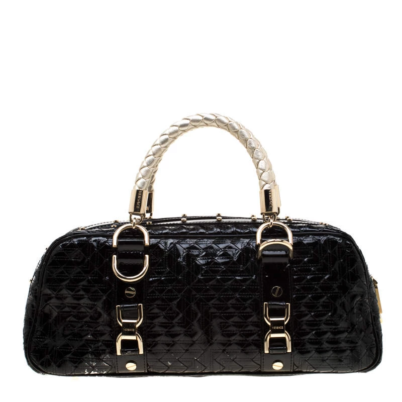 Woven to perfection, this Versace ‘Snap Out Of It’ satchel is in patent leather. It features dual braided top handles, gold-tone hardware, buckle detailing and the metal brand plaque on the front. The top zip closure opens to a fabric-lined interior housing enough space to store your necessities. The satchel is complete with protective metal feet.