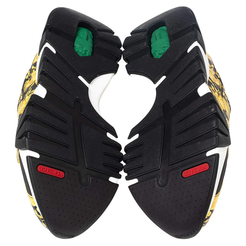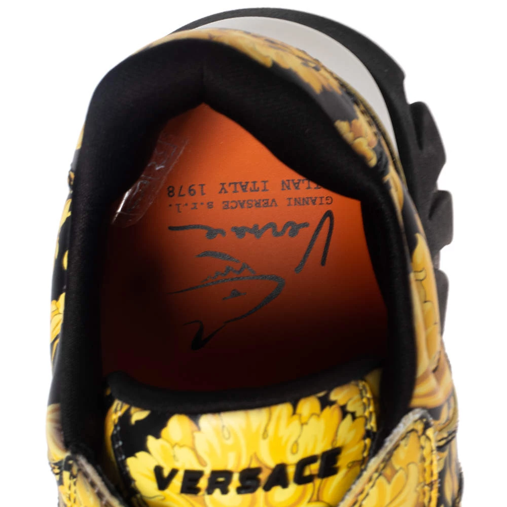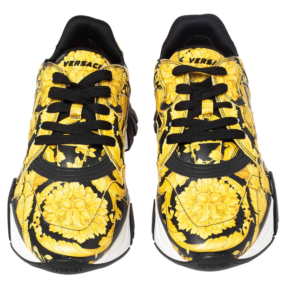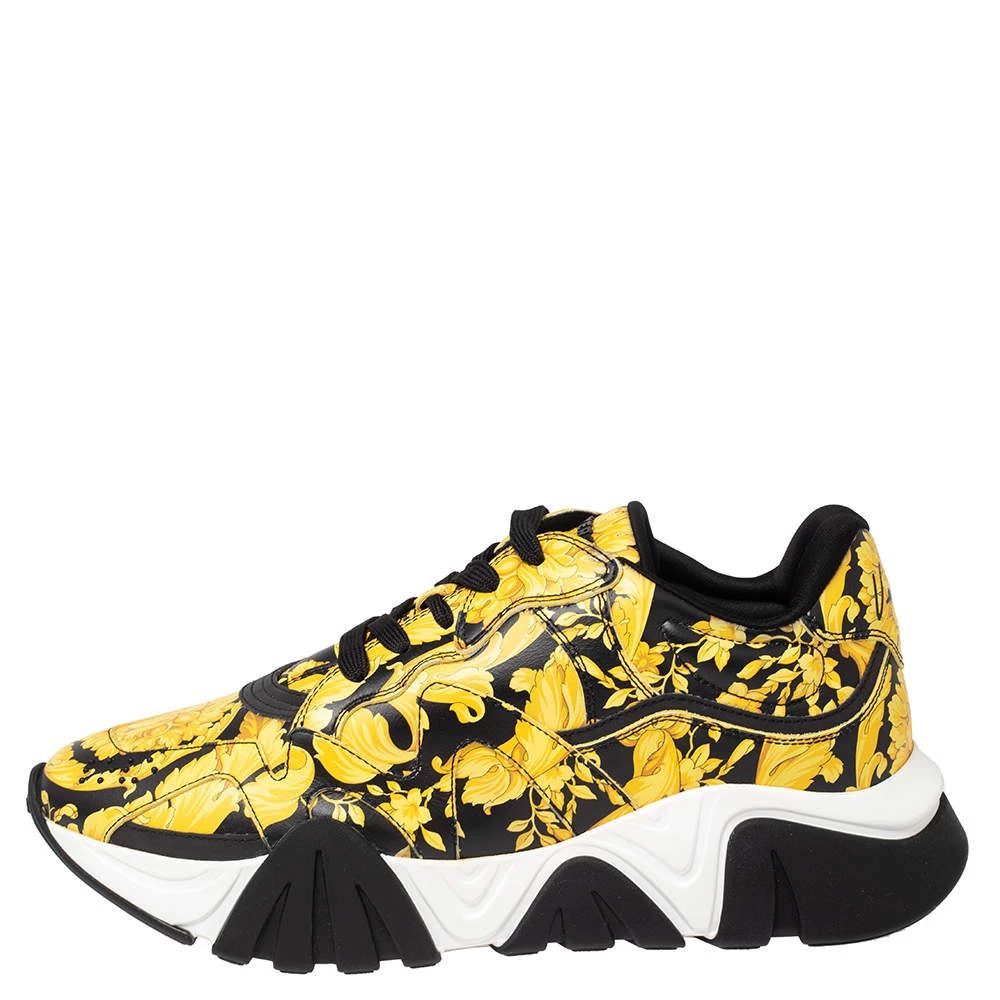Polish your style with these cool and dashing Versace Squalo sneakers. Accented with an emblematic outsole silhouette and a Barocco print leather exterior, these sneakers also feature lace-ups on the uppers, lovely black & yellow hues and durable rubber soles.