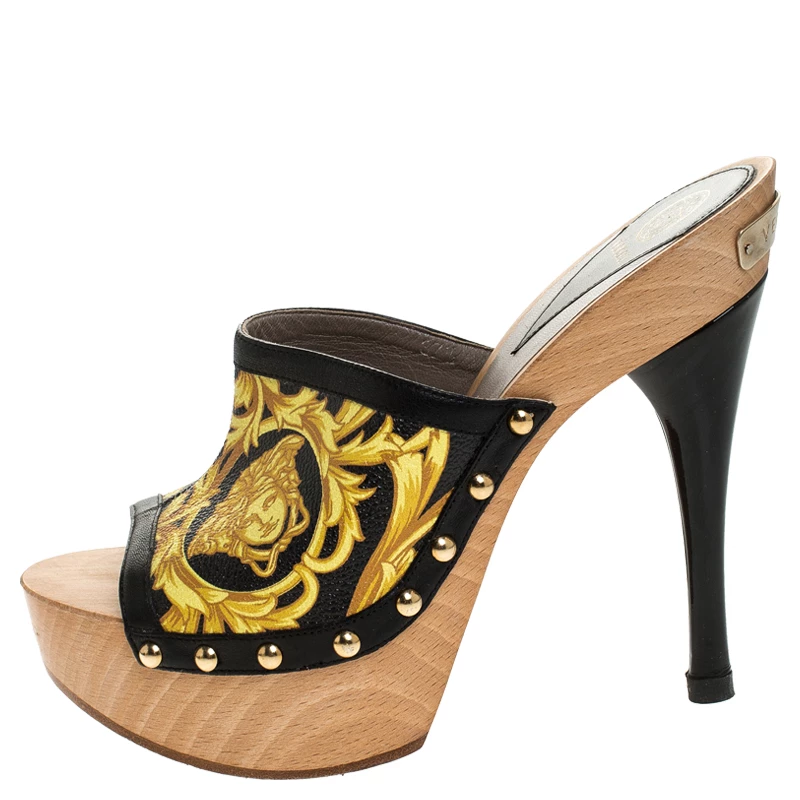 These platform clogs from Versace promise to adorn your feet with utmost style! They are crafted from Barocco-printed leather and feature open toes. They are complete with 14 cm heels supported by platforms.