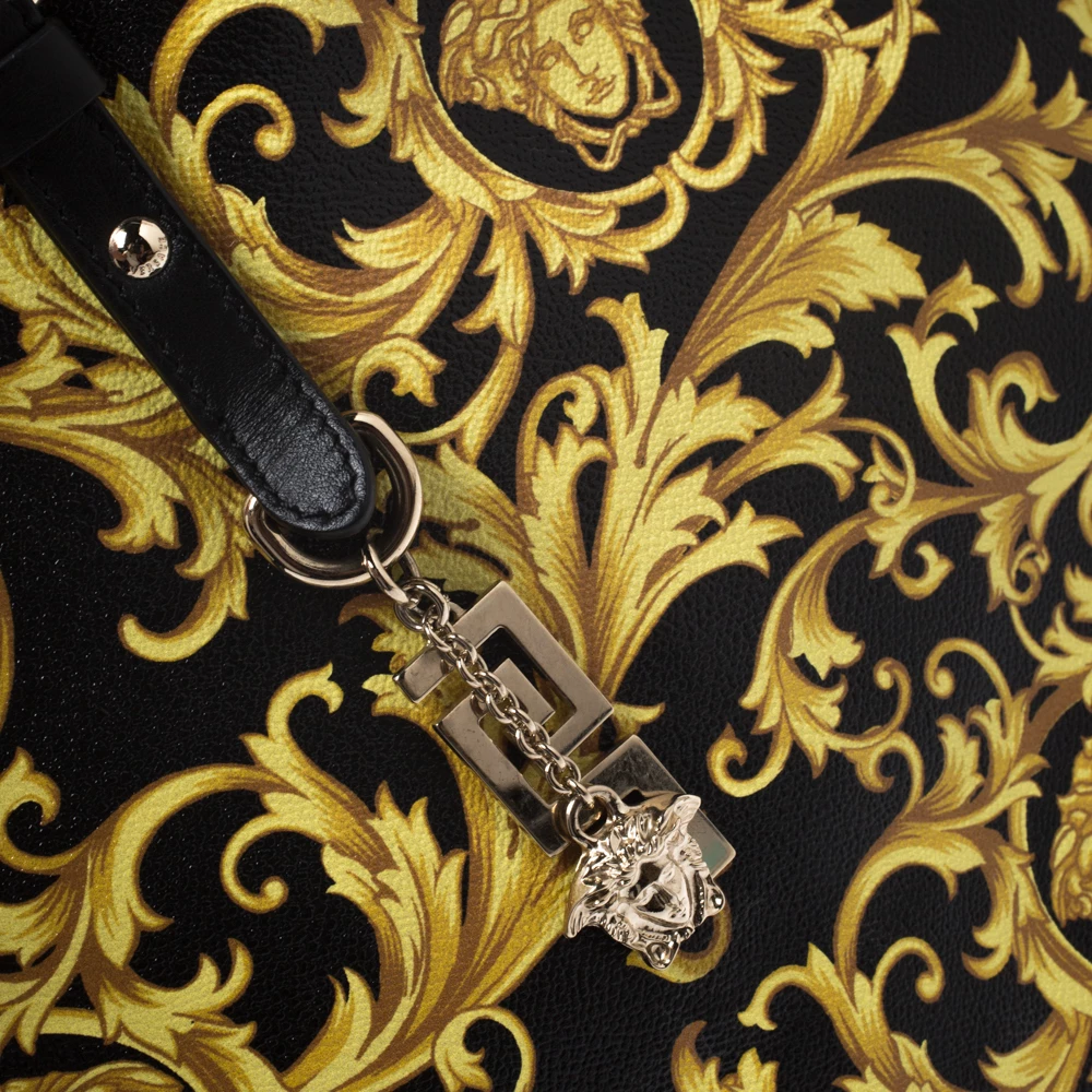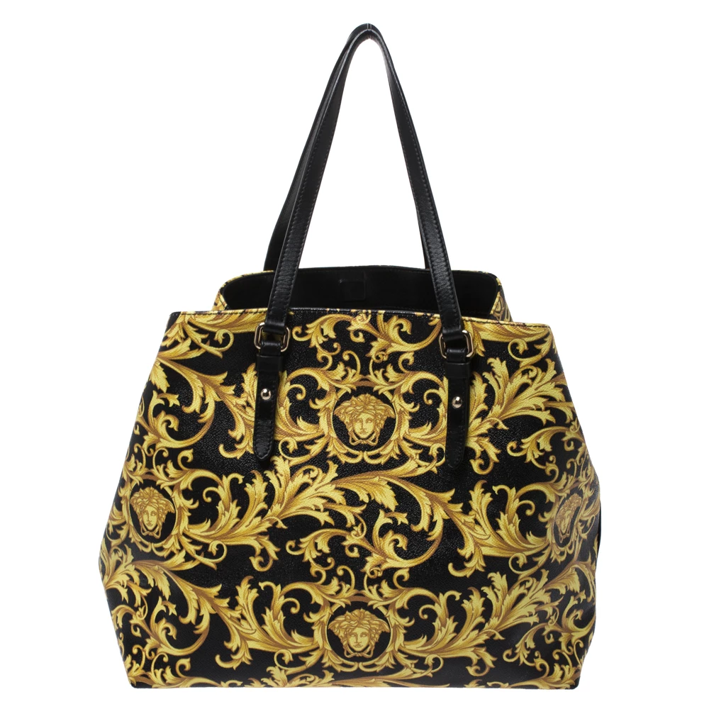 This Versace tote is made from black-yellow Borocco printed canvas with signature Medusa motifs. It boasts of an ultra-spacious canvas-lined interior that houses one zipped and two slip pockets. It is equipped with double leather handles for easy carrying experience and a gold-tone Medusa charm.