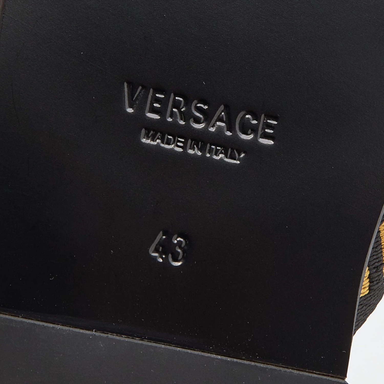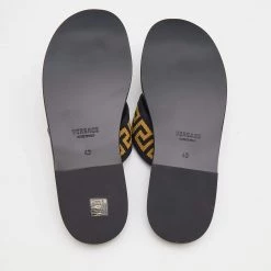 Slip into these Versace sandals and experience comfort while you lounge around or go out to run errands. These flats have been crafted using leather with Medusa metal studs and fabric straps with Greca motifs.