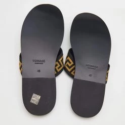 Slip into these Versace sandals and experience comfort while you lounge around or go out to run errands. These flats have been crafted using leather with Medusa metal studs and fabric straps with Greca motifs.
