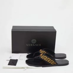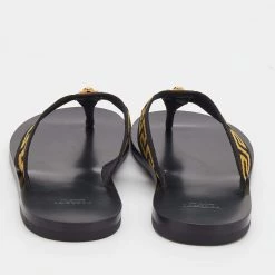 Slip into these Versace sandals and experience comfort while you lounge around or go out to run errands. These flats have been crafted using leather with Medusa metal studs and fabric straps with Greca motifs.