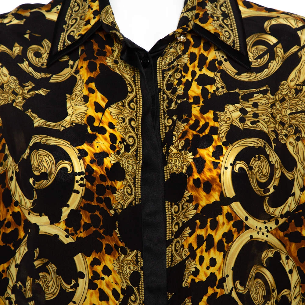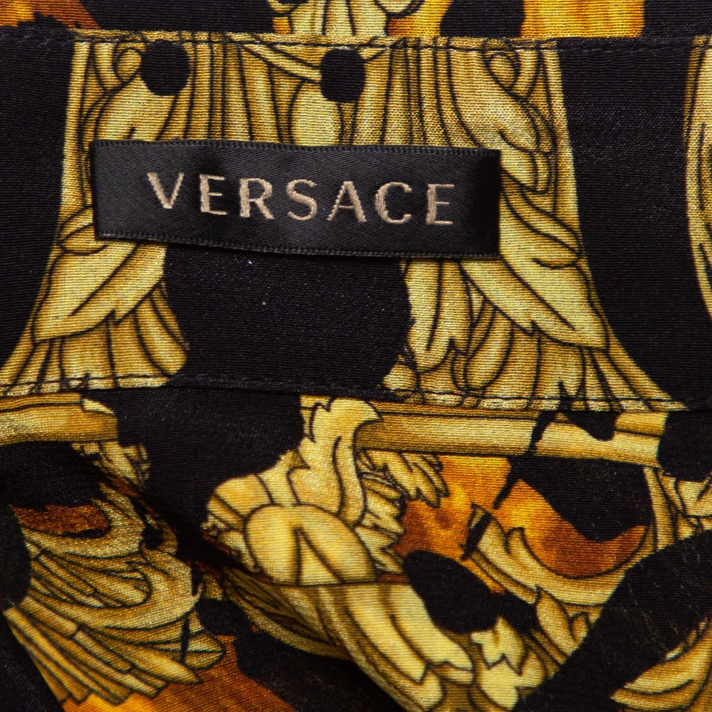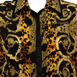 This artsy shirt from Versace is crafted from the finest quality silk. The full-sleeved shirt has the signature print in black and yellow shades throughout. Pair it with plain trousers or skirt.