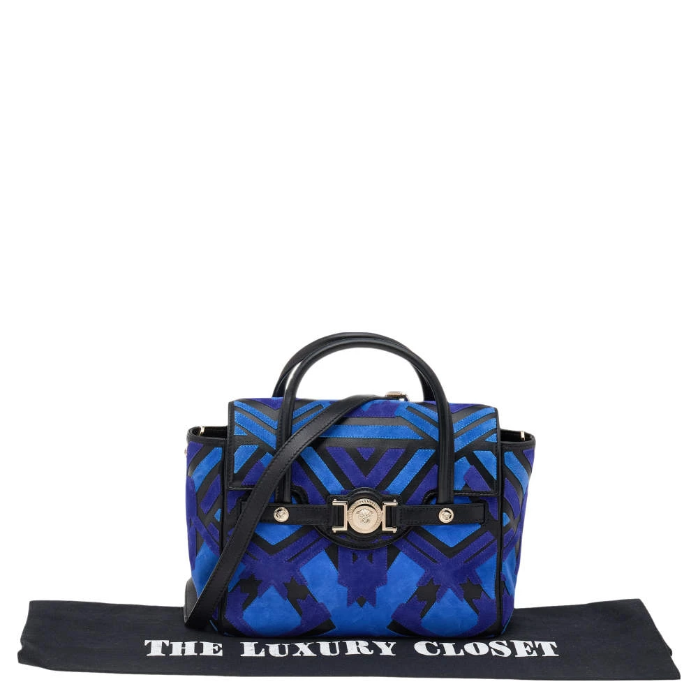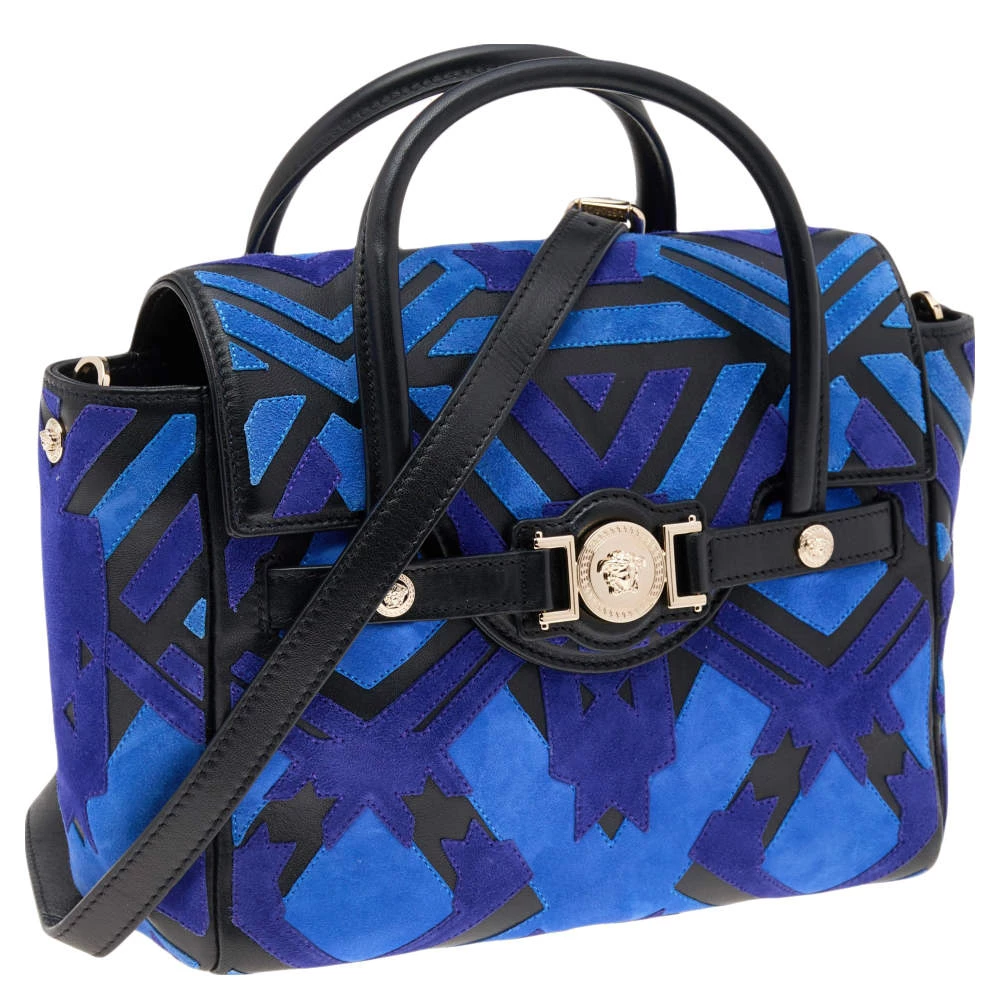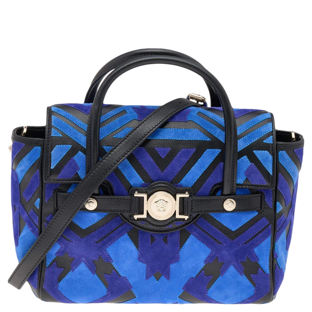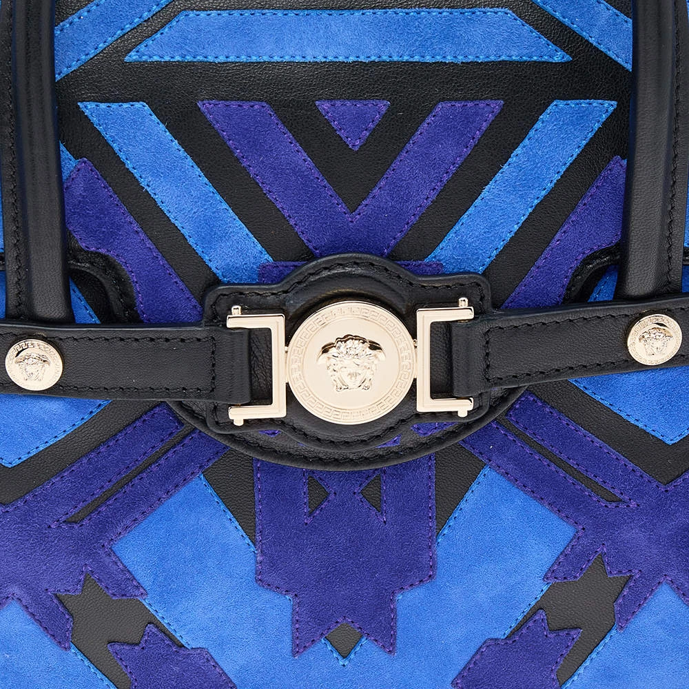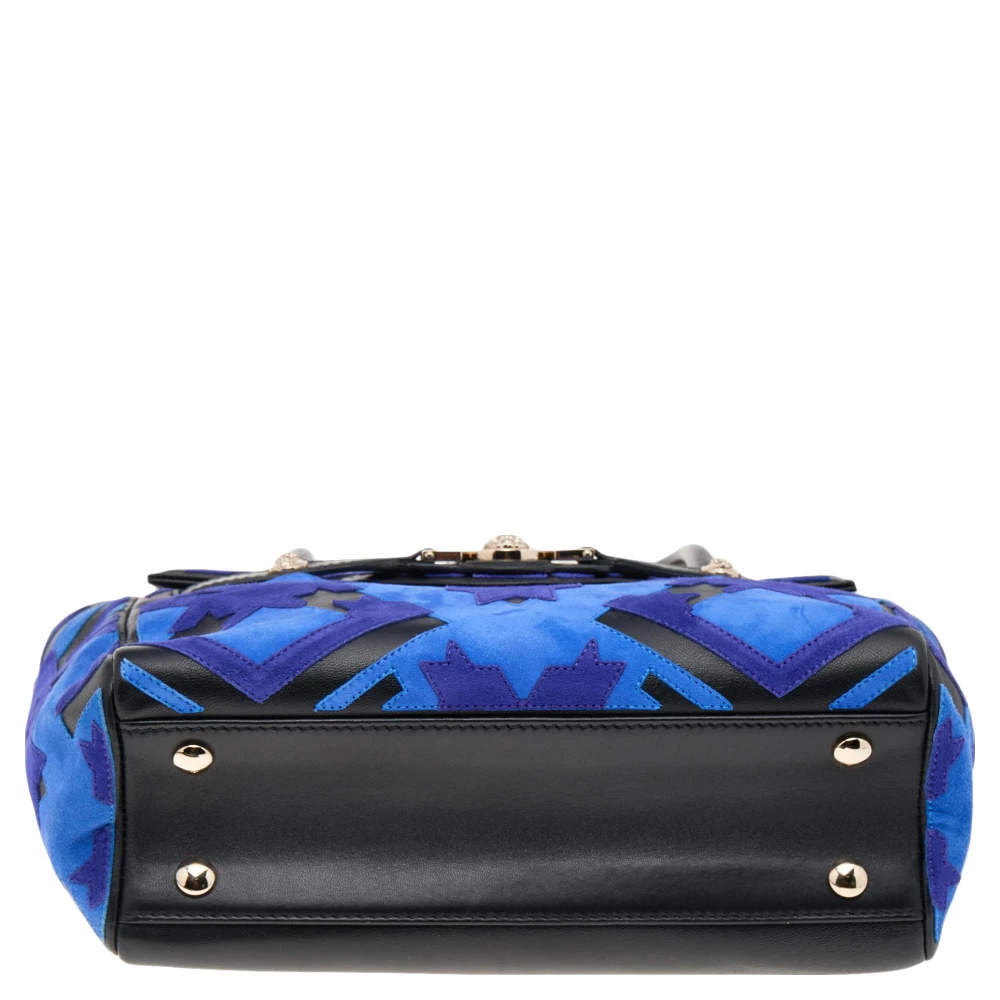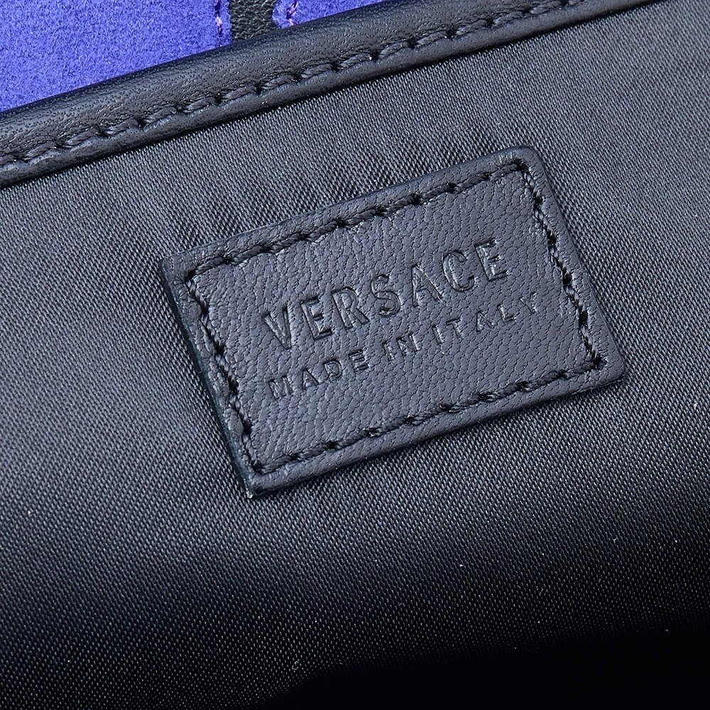 The black leather exterior of the Versace bag is layered with suede patches to achieve a winning end result. The flap easily lifts to give access to your everyday essentials and the dual handles allow the bag to be carried in your hand or in the hook of your arm.