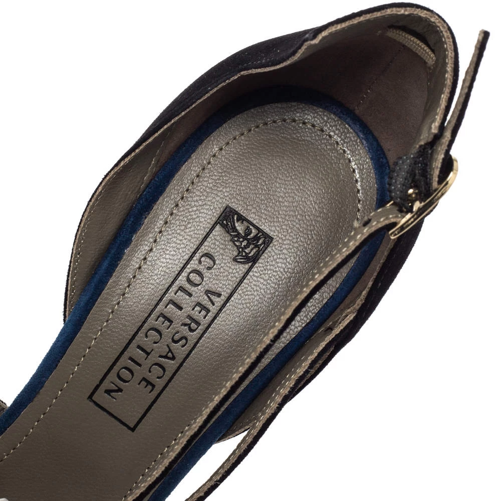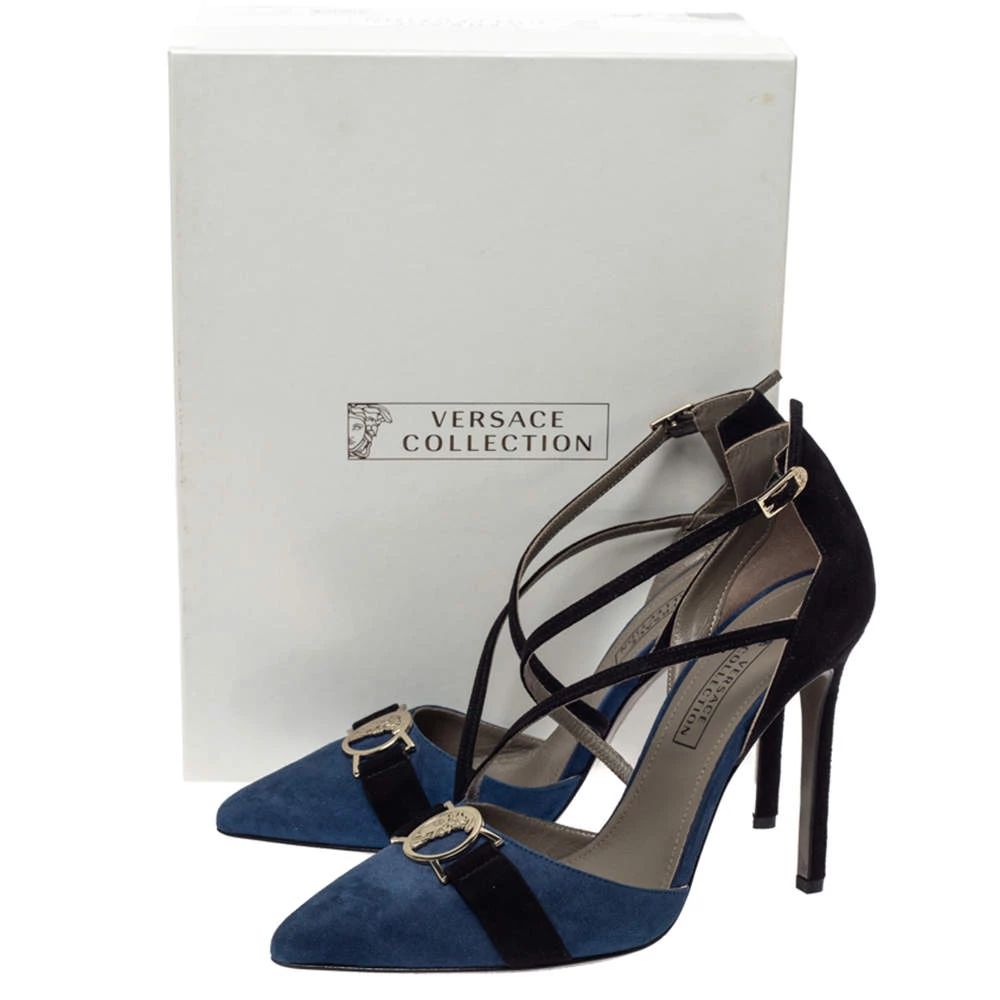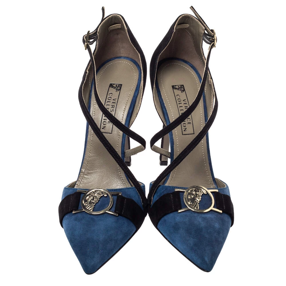 These Versace pumps have been styled to deliver style and sophistication. Crafted from quality suede, they come in lovely hues of blue & black. They have covered counters, strappy silhouette and buckled closures. The pointed toes are highlighted with the Medusa logo in gold-tone. They are finished with 11 cm heels.