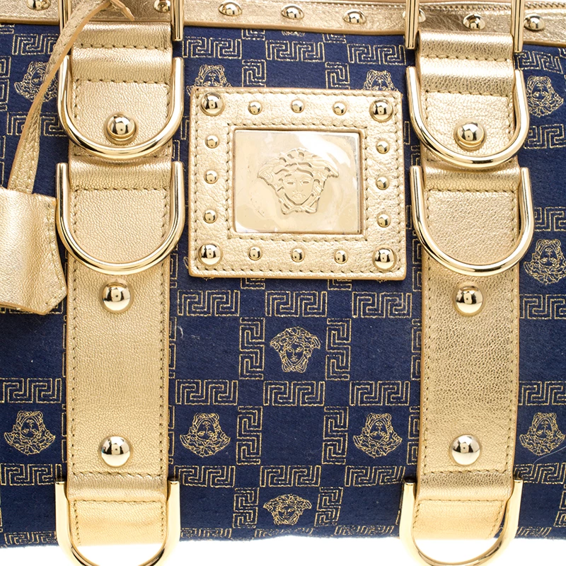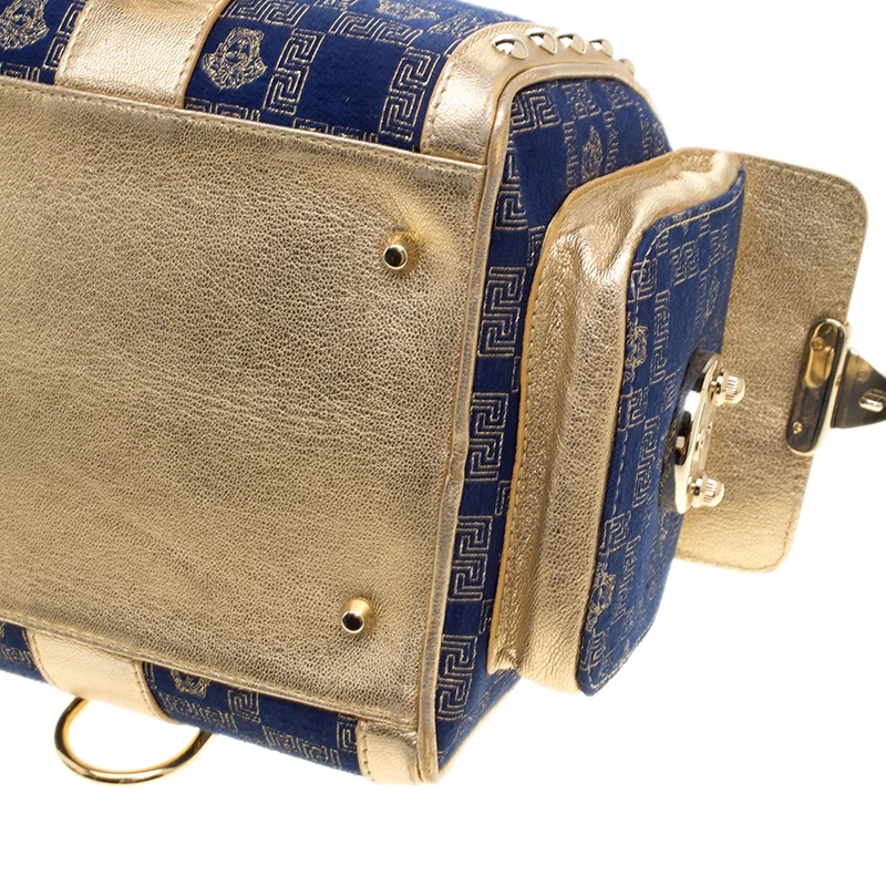 How gorgeous is this satchel from Versace! It carries an outstanding design and a fabulous interplay of blue fabric and gold leather. It has a top leading to a fabric interior while being held by two top handles. The signature prints and the brand logo on the front just uplift its beauty and makes it a buy you will not regret.