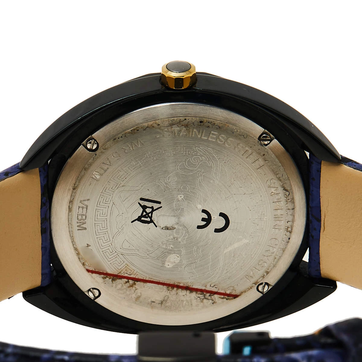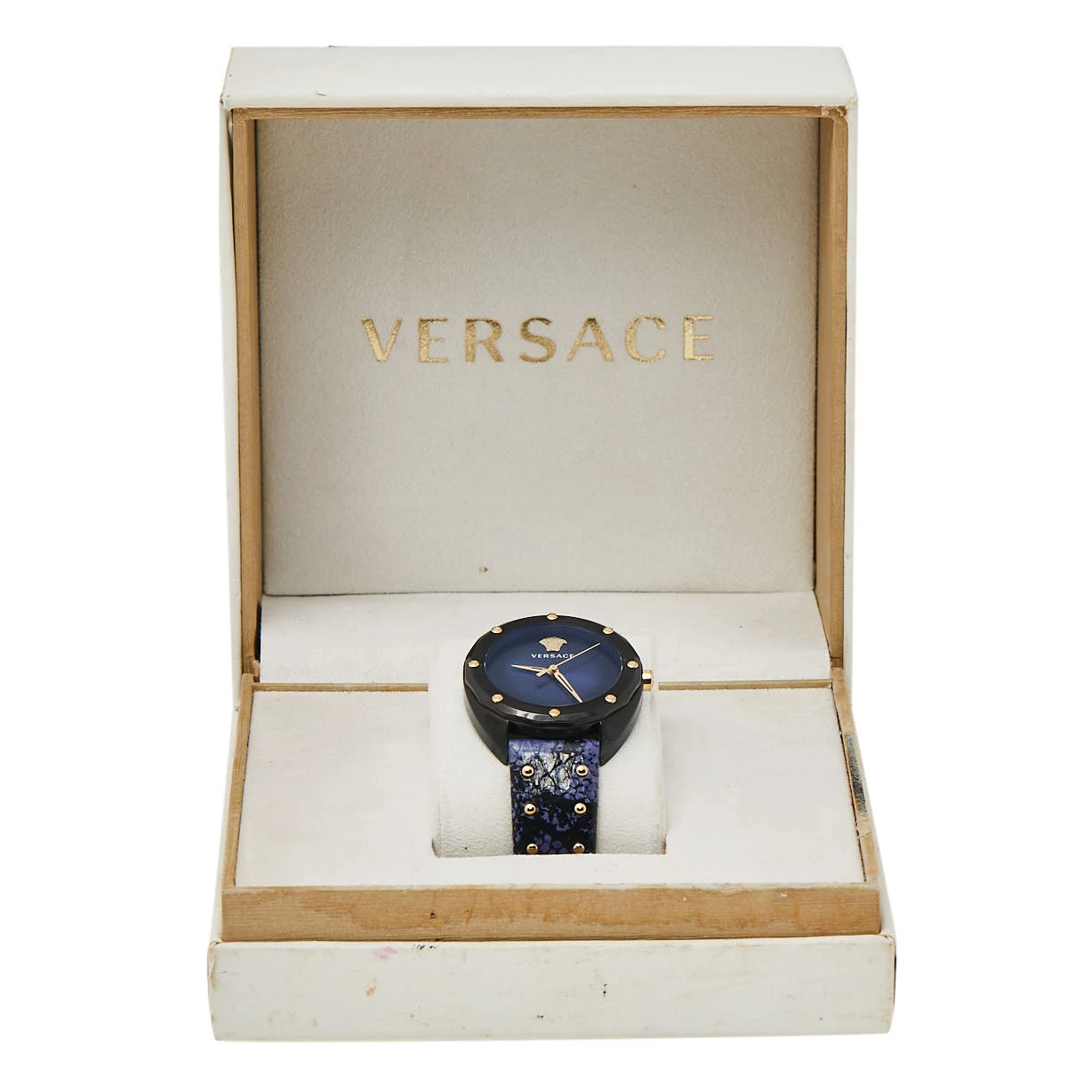 Simple, elegant, and sophisticated, this Versace Shadov watch will give your everyday outfits a feminine look. Made from ion-plated steel, the 38 mm case comes with a blue dial featuring three hands along with the Medusa logo. The bezel and the bracelet are adorned with gold-tone stud embellishments. This 50m water-resistant watch is a must-have!