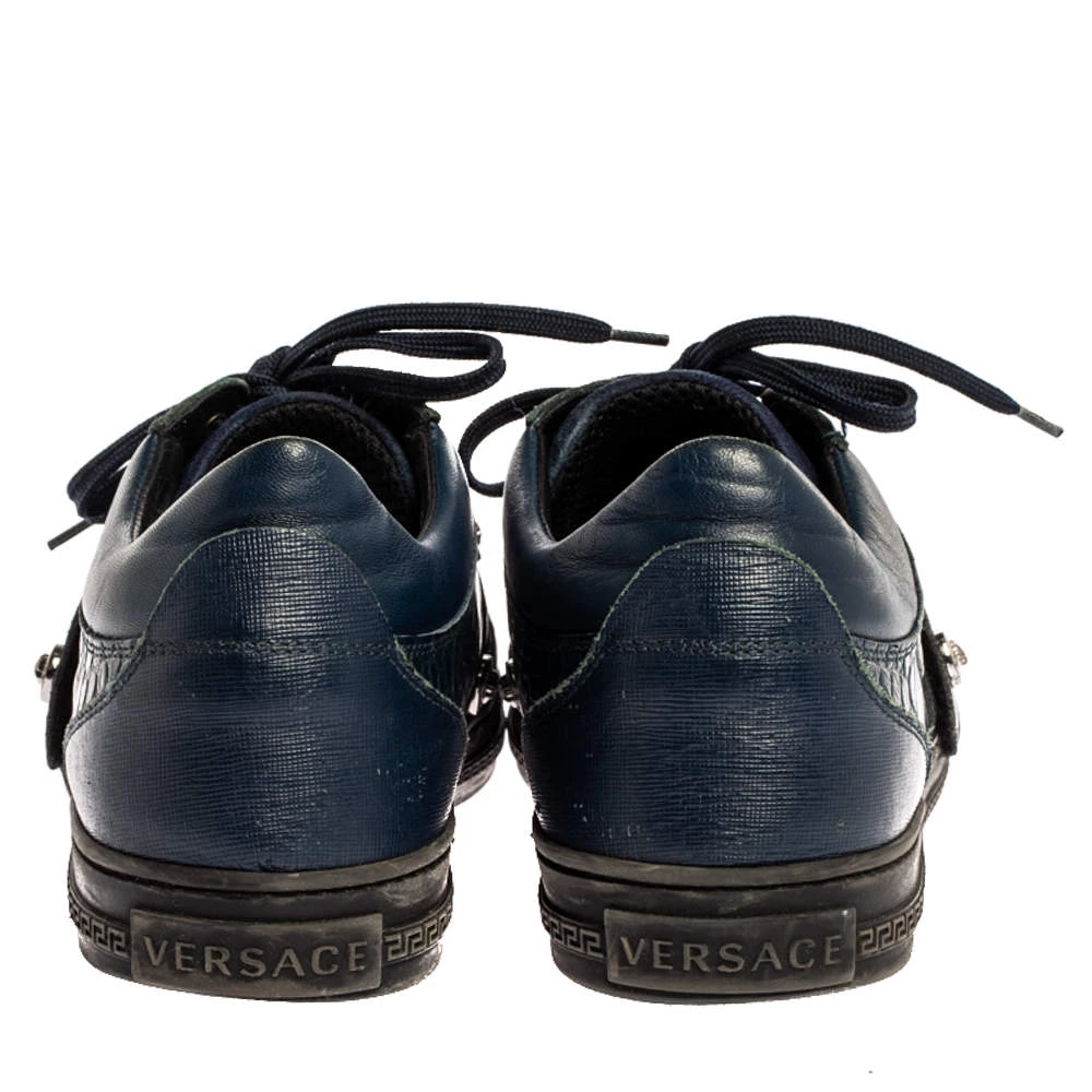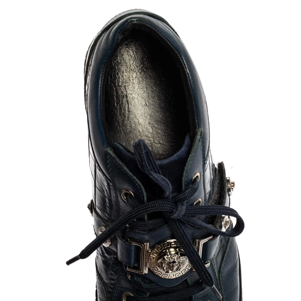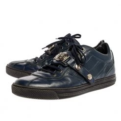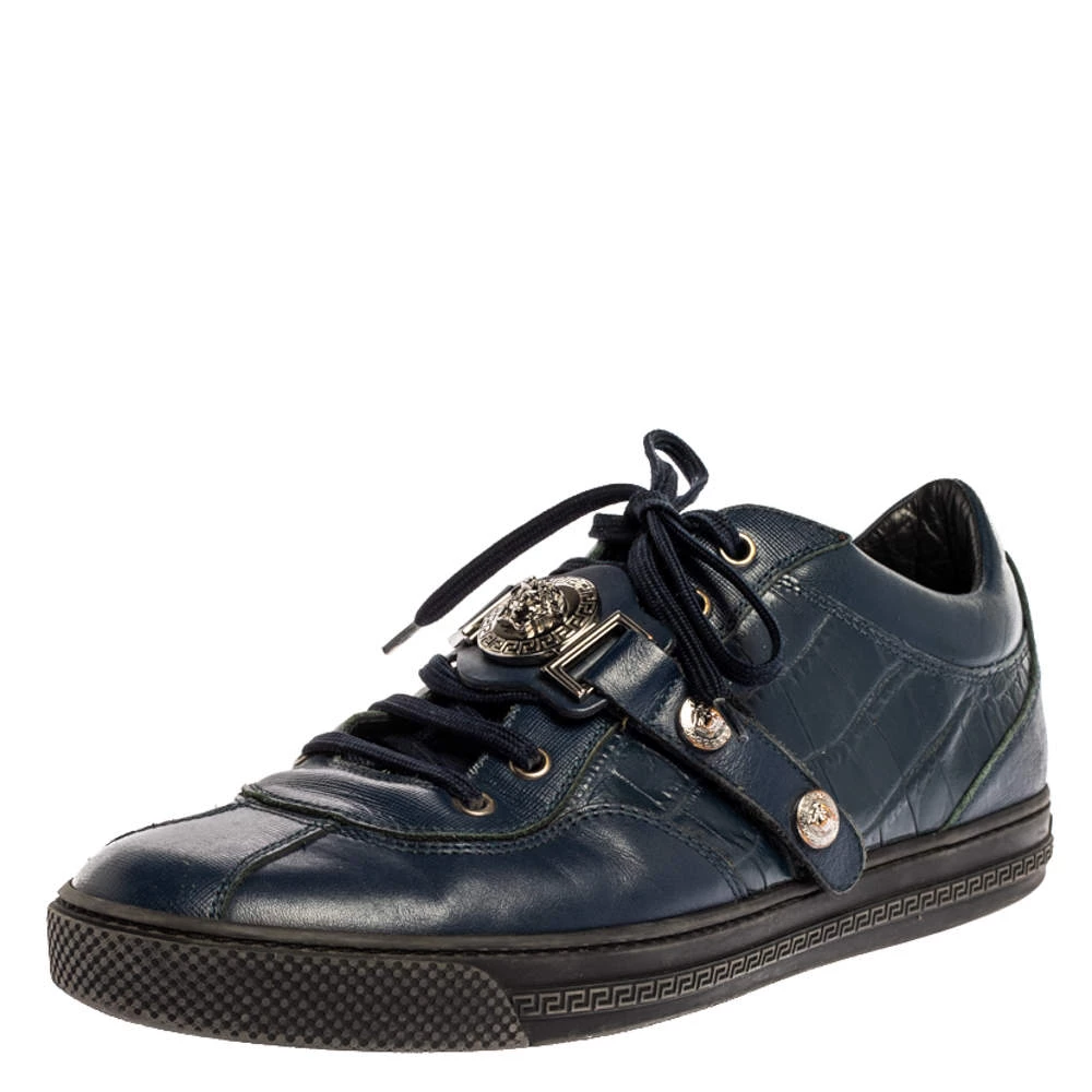 These leather sneakers are meant to lend a luxe twist to your outfit. Looking fashionable in your casuals is as easy as slipping into these blue sneakers. Designed by Versace, they feature the Medusa detail, croc embossing, lace-up vamps and rubber soles.