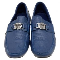 These loafers from the House of Versace are absolutely fascinating in appearance and design! They are made from blue leather on the exterior, with a gunmetal-toned Medusa embellishment perched on the vamps. They are made in a slip-on style.