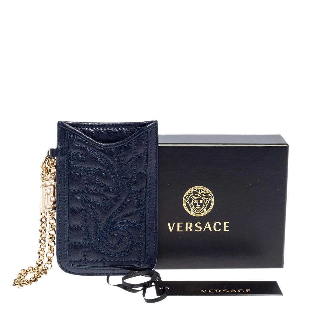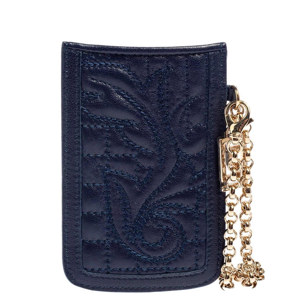 This phone holder from Versace is stylish and practical. Crafted from well-designed leather, it comes with a leather-lined interior to store your phone and other essentials like cards and cash. It features a metal wristlet.