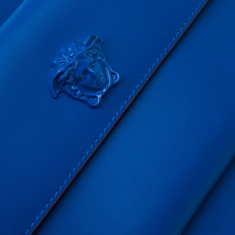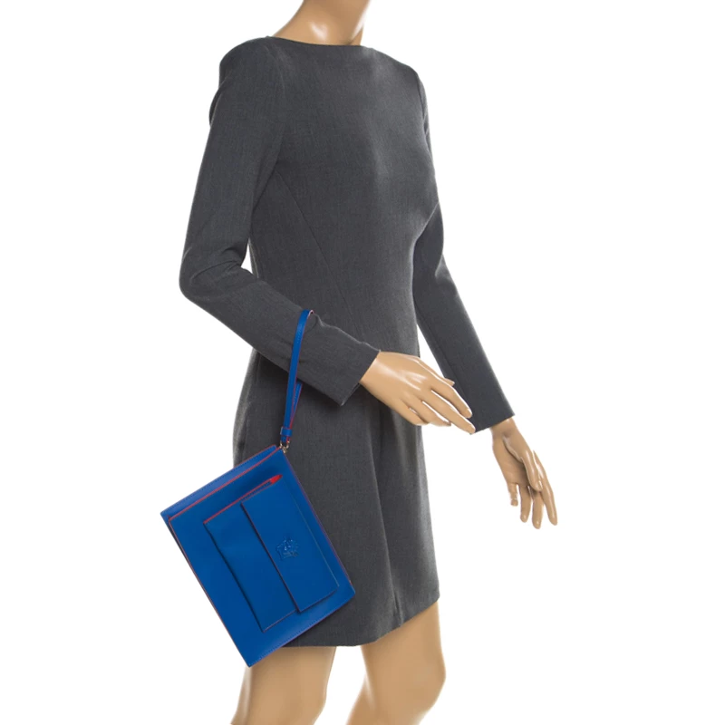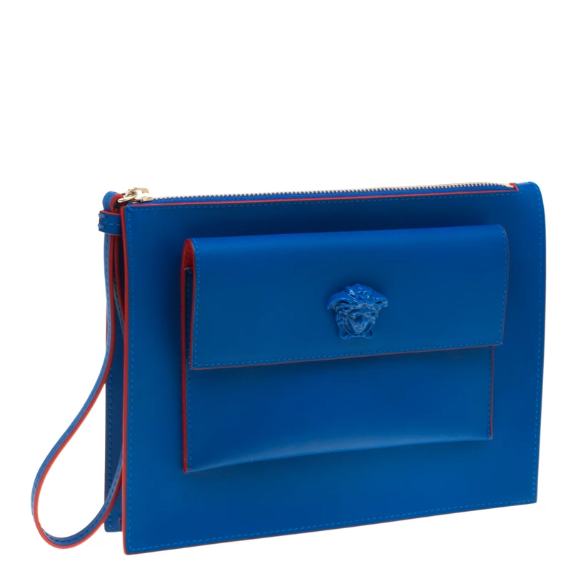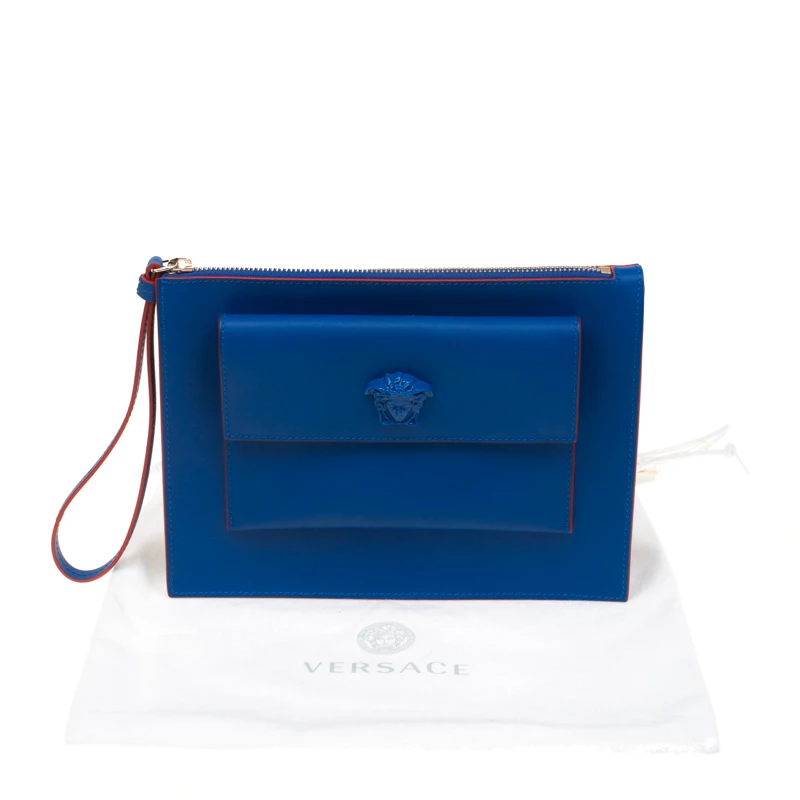 Beautifully crafted from leather, this Versace clutch is a sweet buy! The piece features a flap compartment at the front with the Medusa emblem and interior secured by a zipper. Complete with a wristlet, this clutch is functional and stylish.