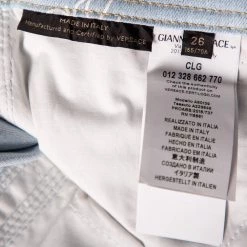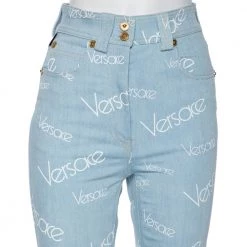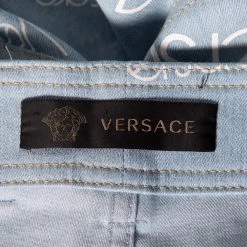 A wardrobe essential gets a luxe update from Versace. The pair of fitted jeans features logo prints, five pockets, belt loops, and front button closure. The blue denim jeans will offer ample comfort and style.