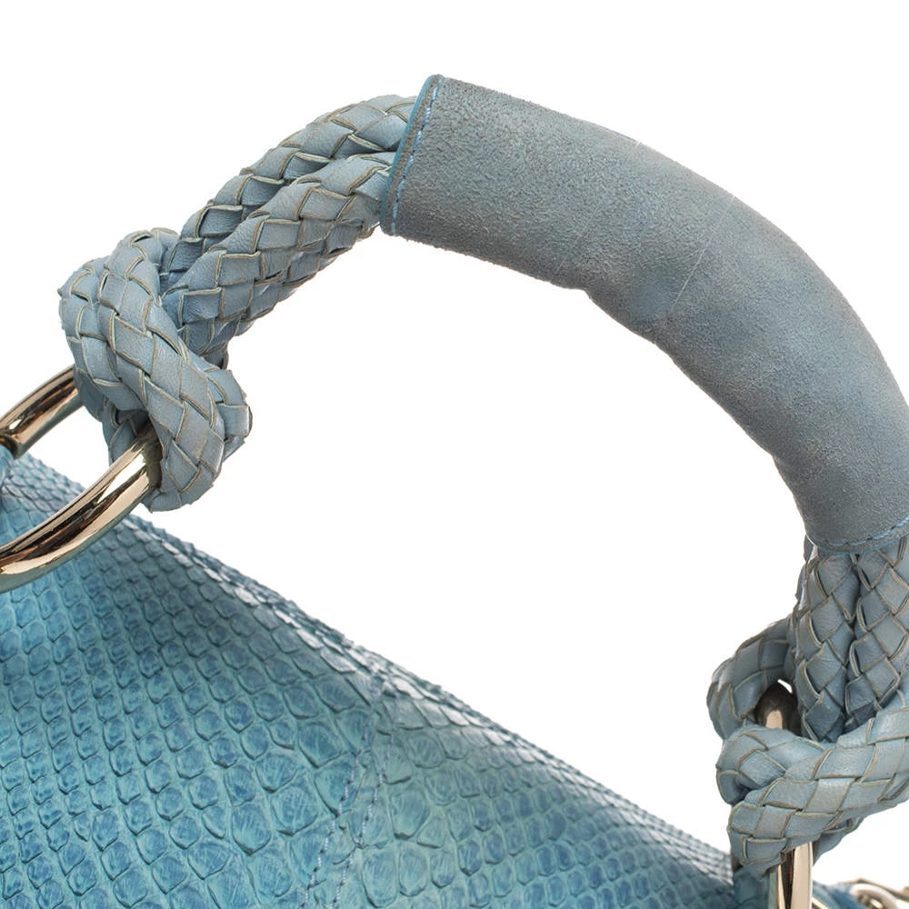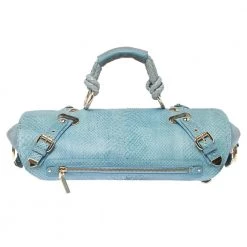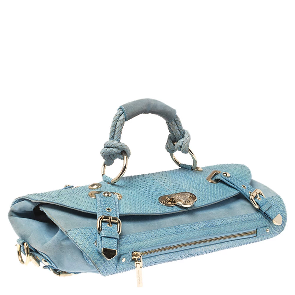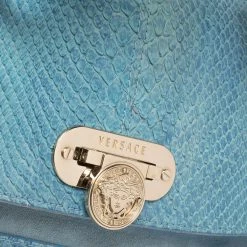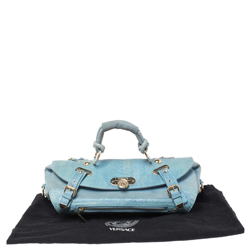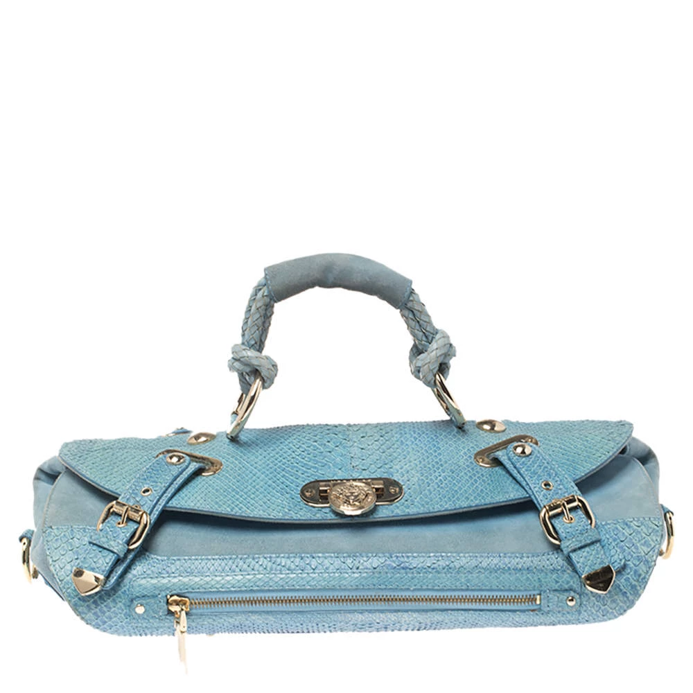 This eye-catching Canyon bag is a Versace creation. It is stylish, one of a kind and extremely glamorous. Crafted in Italy, it is made from blue python skin and suede and is accented with gold-tone hardware. It has buckle detailing on the corners and the satin-lined interior will safely hold all your party essentials. It comes with a zip pocket, a single handle and brand logo on the front. Get this bag and be the talk of the town instantly. (NOTE: FOR UAE CUSTOMERS ONLY)