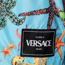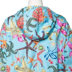 This jacket by Versace presents a fun style. It comes with colorful starfish prints laid on a blue exterior. This creation features a zipped front, pockets, and a hood. It has been cut to deliver a comfortable fit.