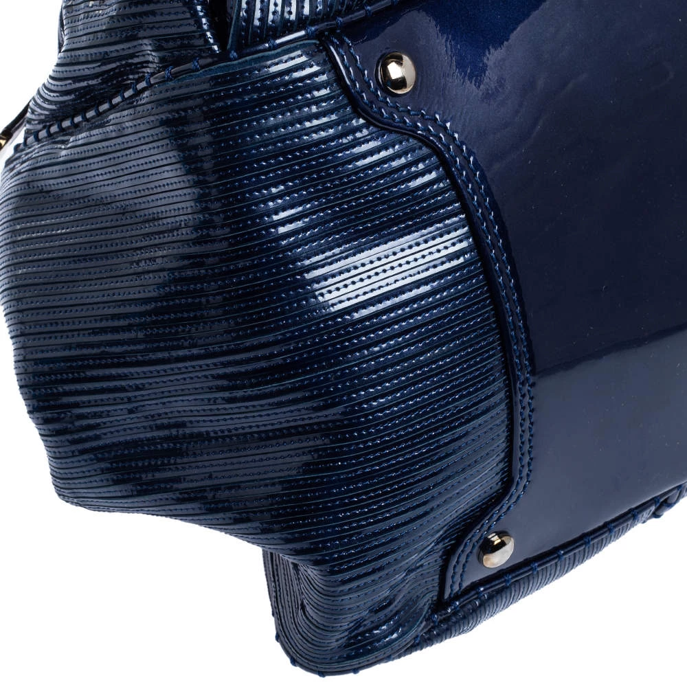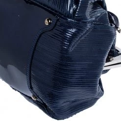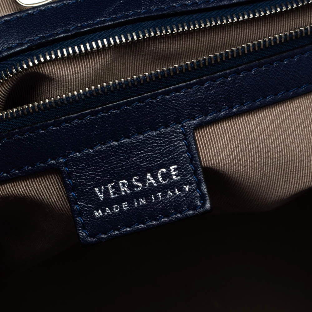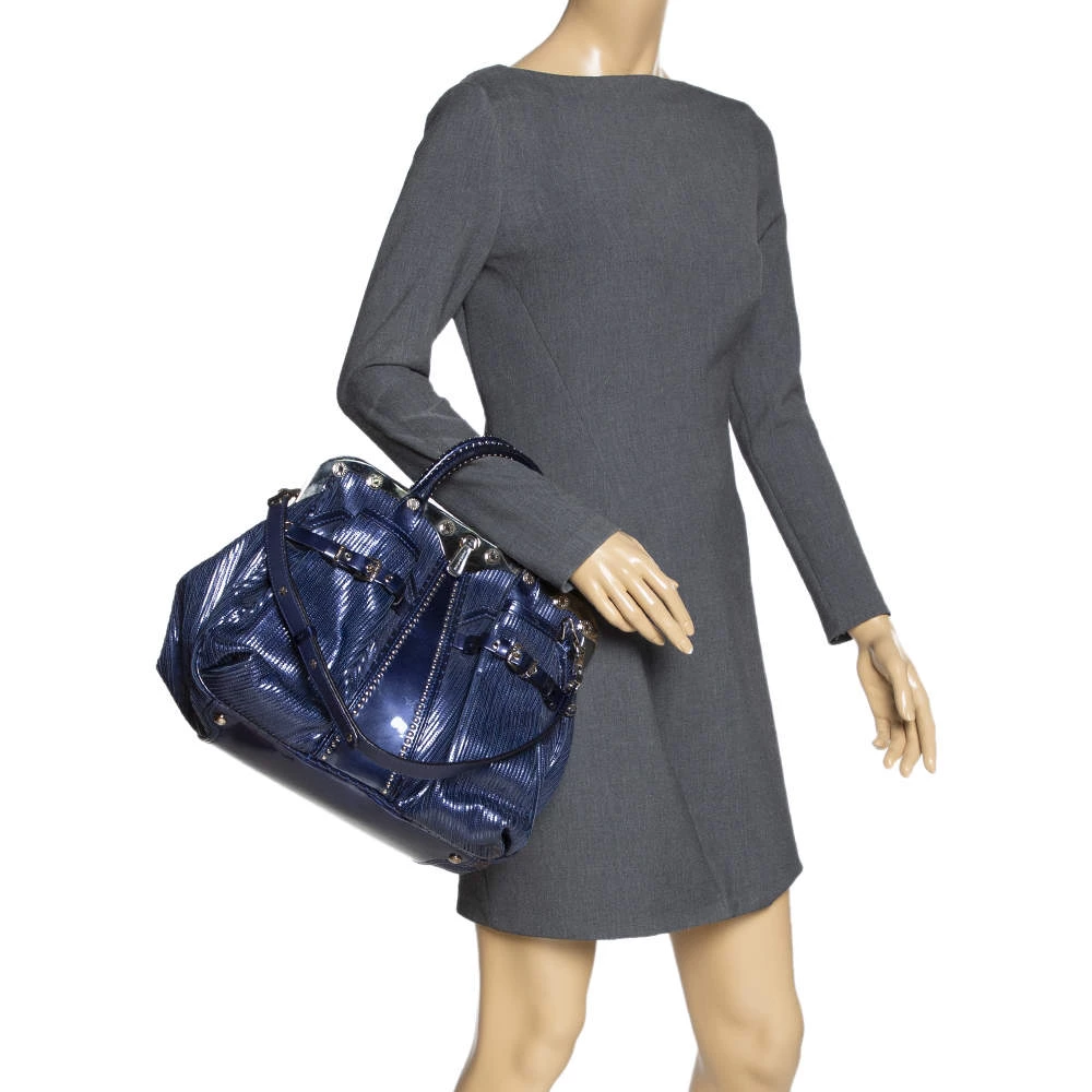 A gorgeous satchel by Versace that is characterised by great craftsmanship and alluring details all over. The satchel, made from glossy patent leather, features a blue shade and a striped texture all over the exterior. It is decorated with buckled straps and zip detailing along with label-engraved studs and the Medusa motif on the metal-framed top. The satchel is complete with two handles and a spacious interior to house your necessities.